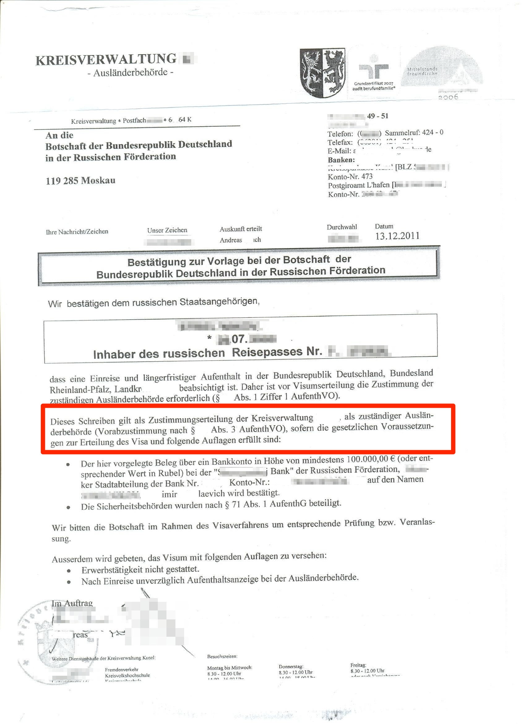 А вот еще один интересный документ от Ведомства по Делам Иностранцев (Auslenderbechörde ), который был получен нашим клиентом для предоставления в посольство Германии, для получения национальной визы "Д" в красном поле выделена просьба выдать визу для указанного гражданина с дальнейшей целью получения ВНЖ, но ВнЖ выдается без право на работу, именно так как и на писано в представленном выше скане ВНЖ. Studium und Erwerbstätigkeit jeglicher Art nicht erlaubt Пер.Обучение и любая другая промысловая деятельность не разрешена.