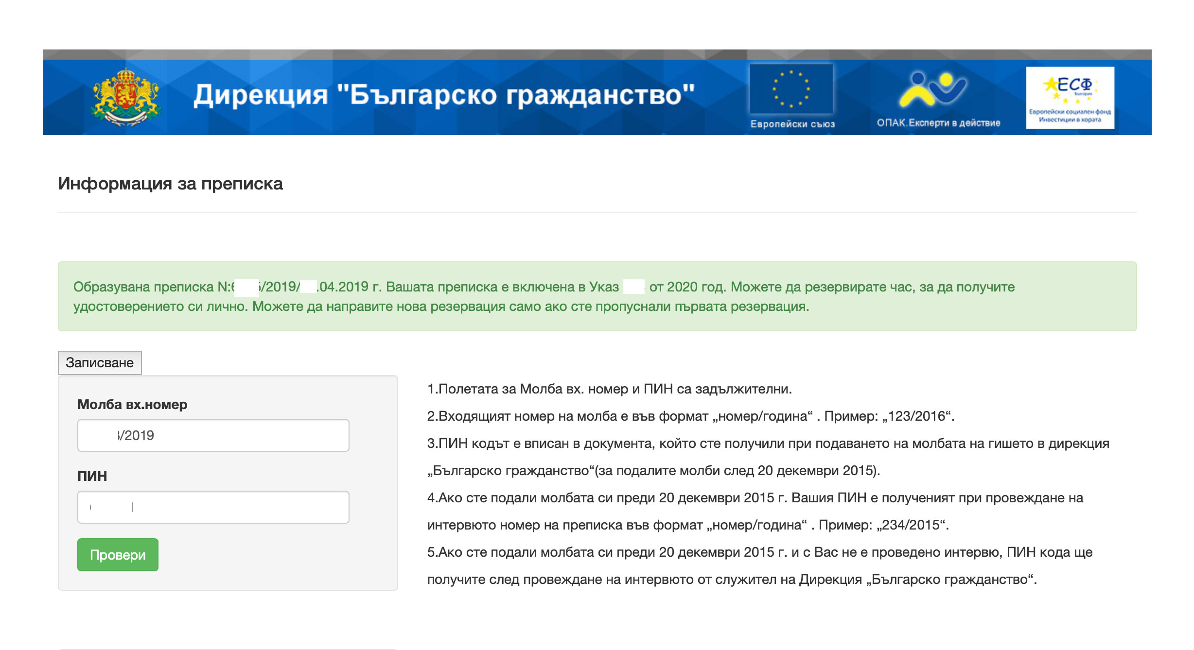 Если я правильно поняла, на сайтеhttps://publicbg.mjs.bg/BgInfo после введения номера и пина, вам высвечивает, что издадено удостоверение, которое обменивается на паспорт?