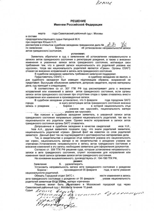 stoyanov писал(а):Источник цитаты Вопрос: что вы вкладываете в понятие "восстановлены документы" или "изменены в части записи о национальности"