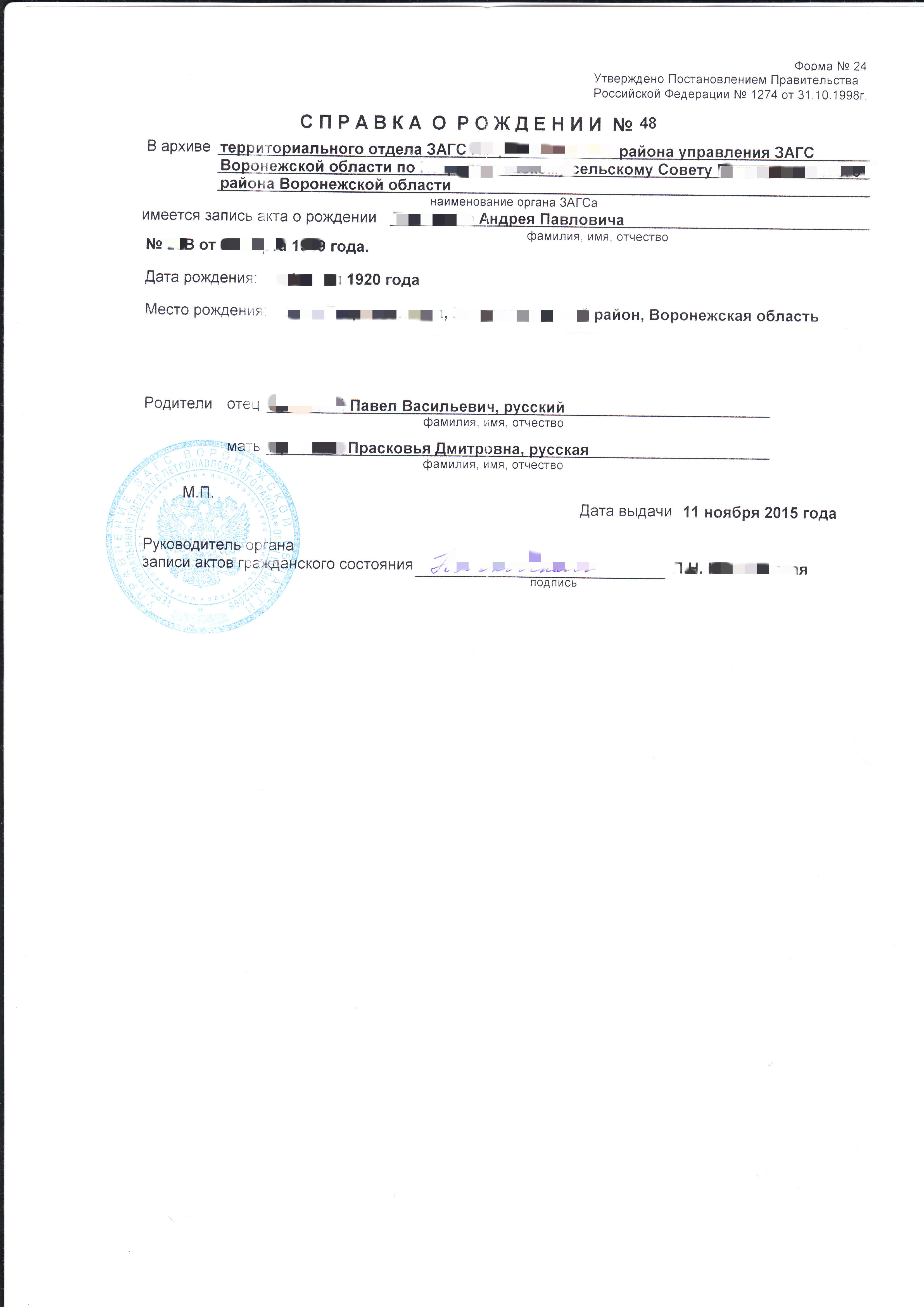Например мой дед по отцовской линии: Андрей Павлович родился в 1920г в Воронежской области (УНР), которая потом стала РСФСР (Россия)