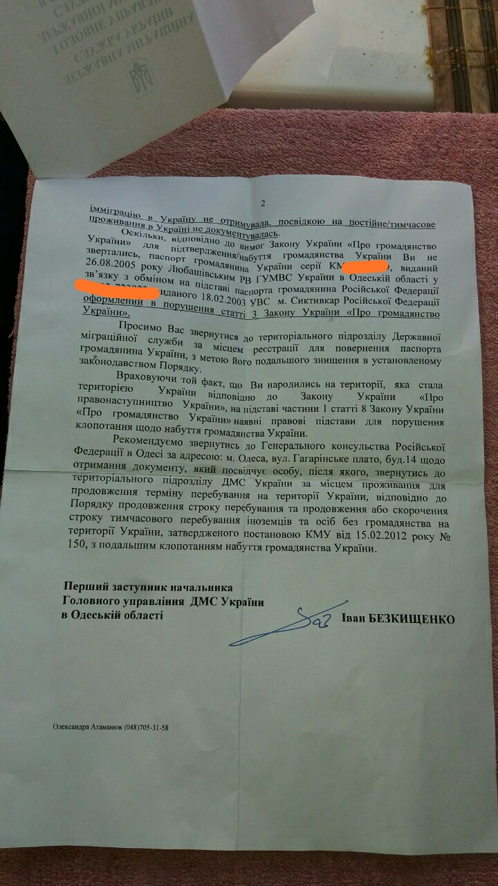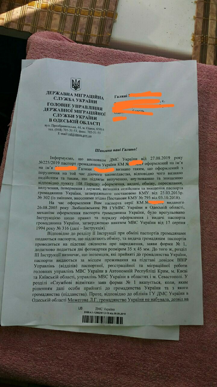 Привет ребята! Дело следующее. В 2003 году отец и бабушка обратились в МВС Украины для получения паспортов (бабушка родилась на территории Украины в 52-ом). Собрали все документы которые запросила паспортная служба, принесли, отдали. В 2005 году паспорта гр. Украины были готовы, бабушка с папой забрали их, в обмен отдали свои российские загранпаспорта (в момент распада СССР жили РФ). Теперь, через 14 лет после всего этого бабушке приходит письмо из ДМС в котором пишут "в результате служебного расследования ваш паспорт был признан недействительным и таким, что подлежит изъятию и уничтожению". Аргументы у них там такие: паспорт выдан с нарушением (но указывают на нарушения сотрудников МВС, которые выдавали паспорт). Новый паспорт давать не хотят. Какие варианты решения могут быть?