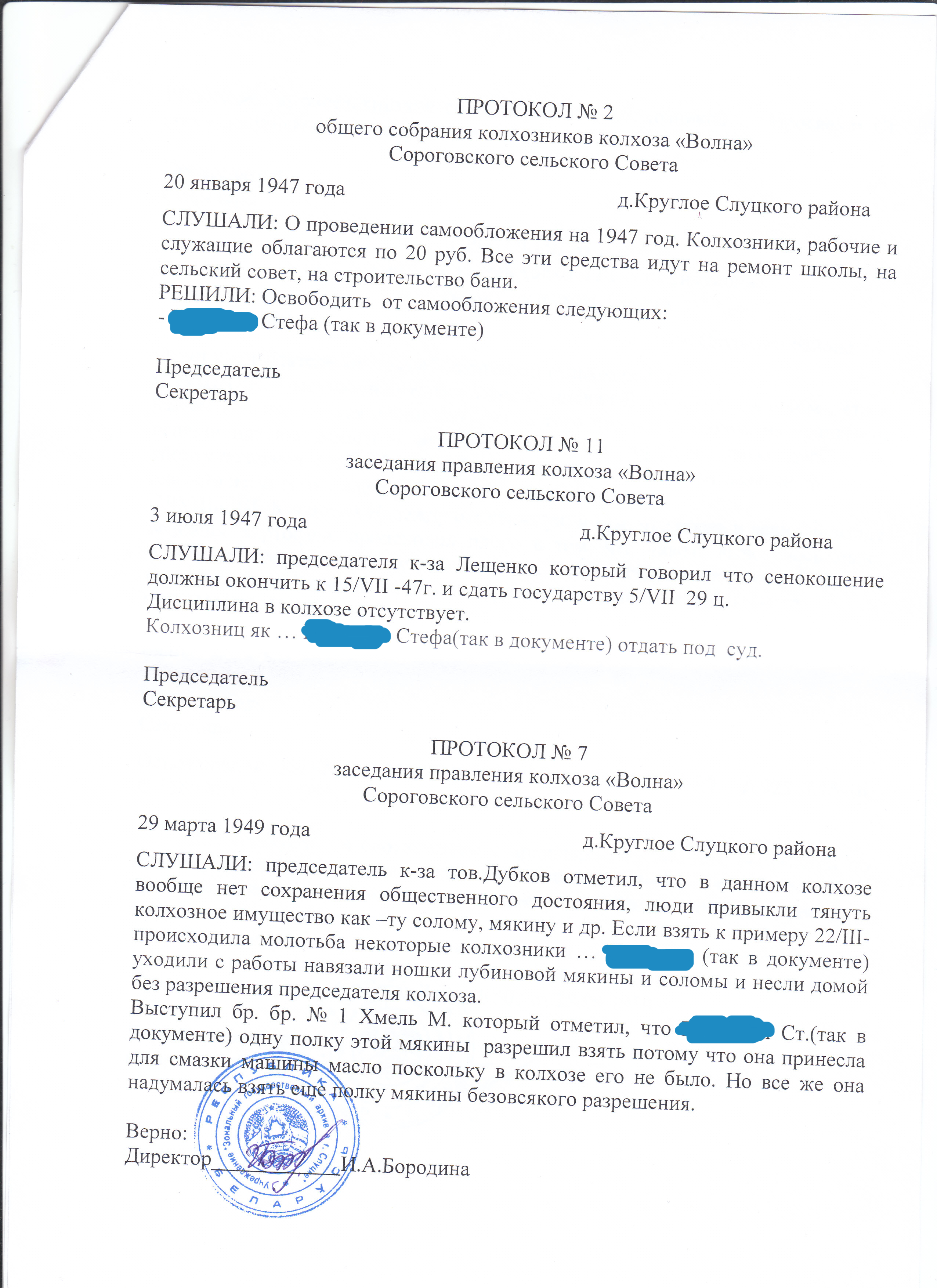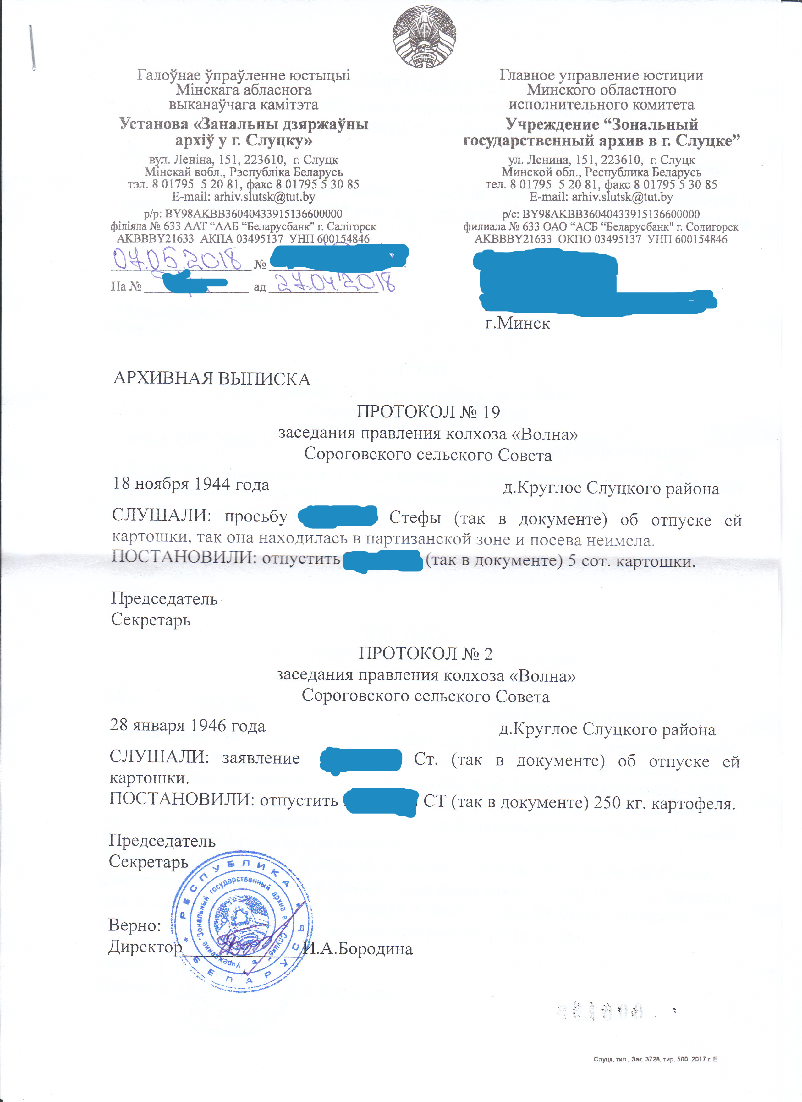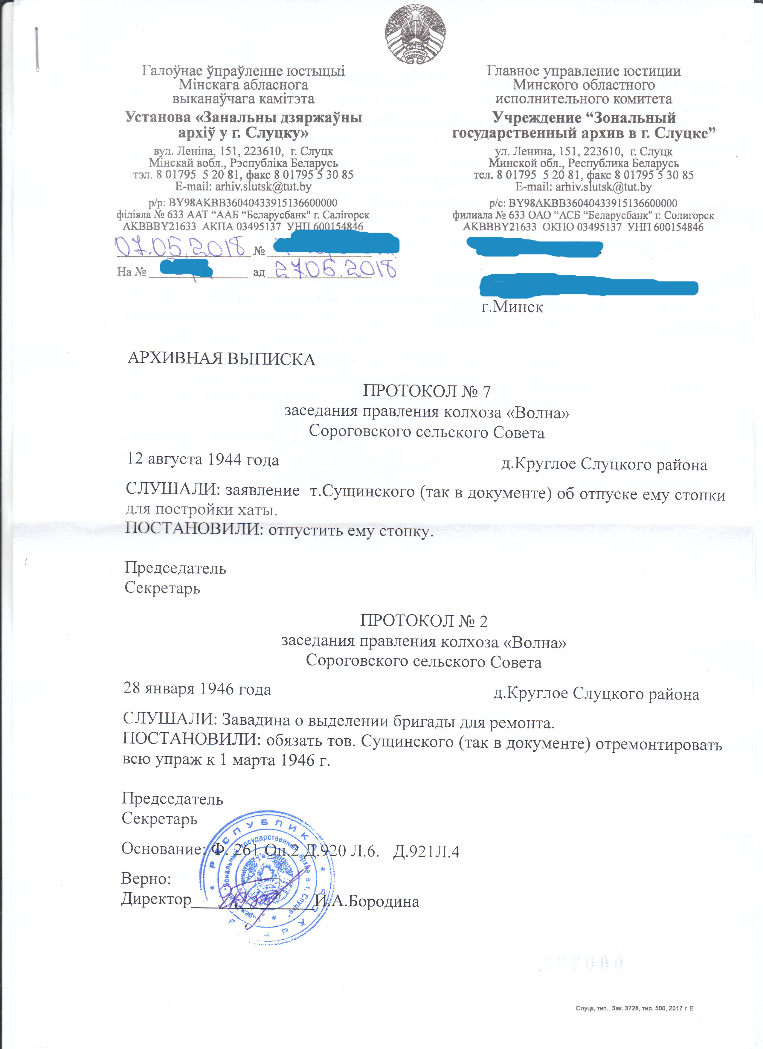 Нечто подобное нашел по деревне Круглое, но уже за 1944г по 1956г в Слуцком зональном архиве (прислали вообще бесплатно на дом. почту) Там упоминаются собрания колхозников на которых участвовала моя бабушка Стефа. Кстати она была мать героиня, так как у ее было пятеро детей. Батька мне рассказывал, что была награждена за это даже медалью. В том Слуцком зональном архиве правда ни чего не нашли про это, но я думаю что в этом архиве Минской области я что нибудь откопаю)