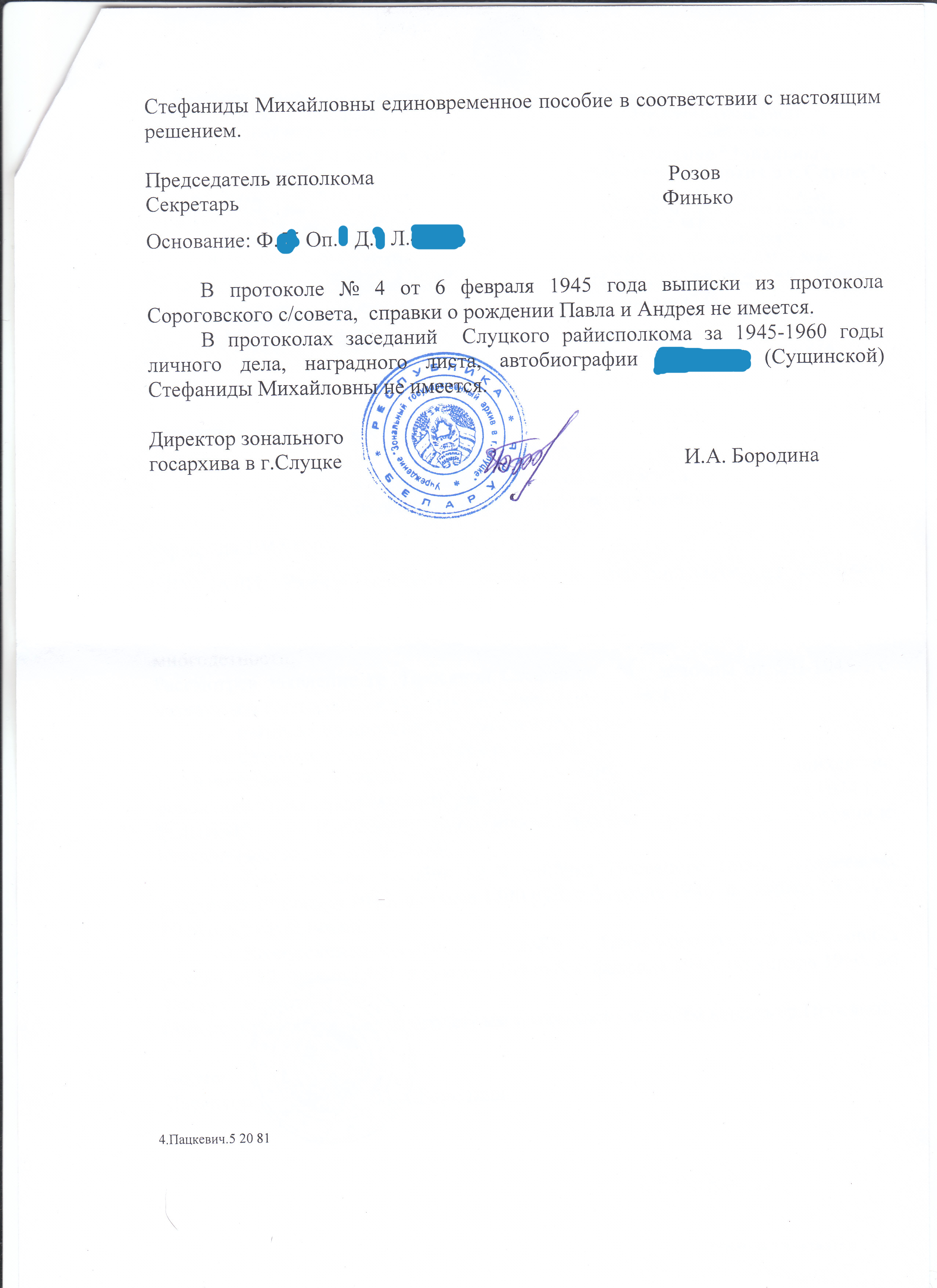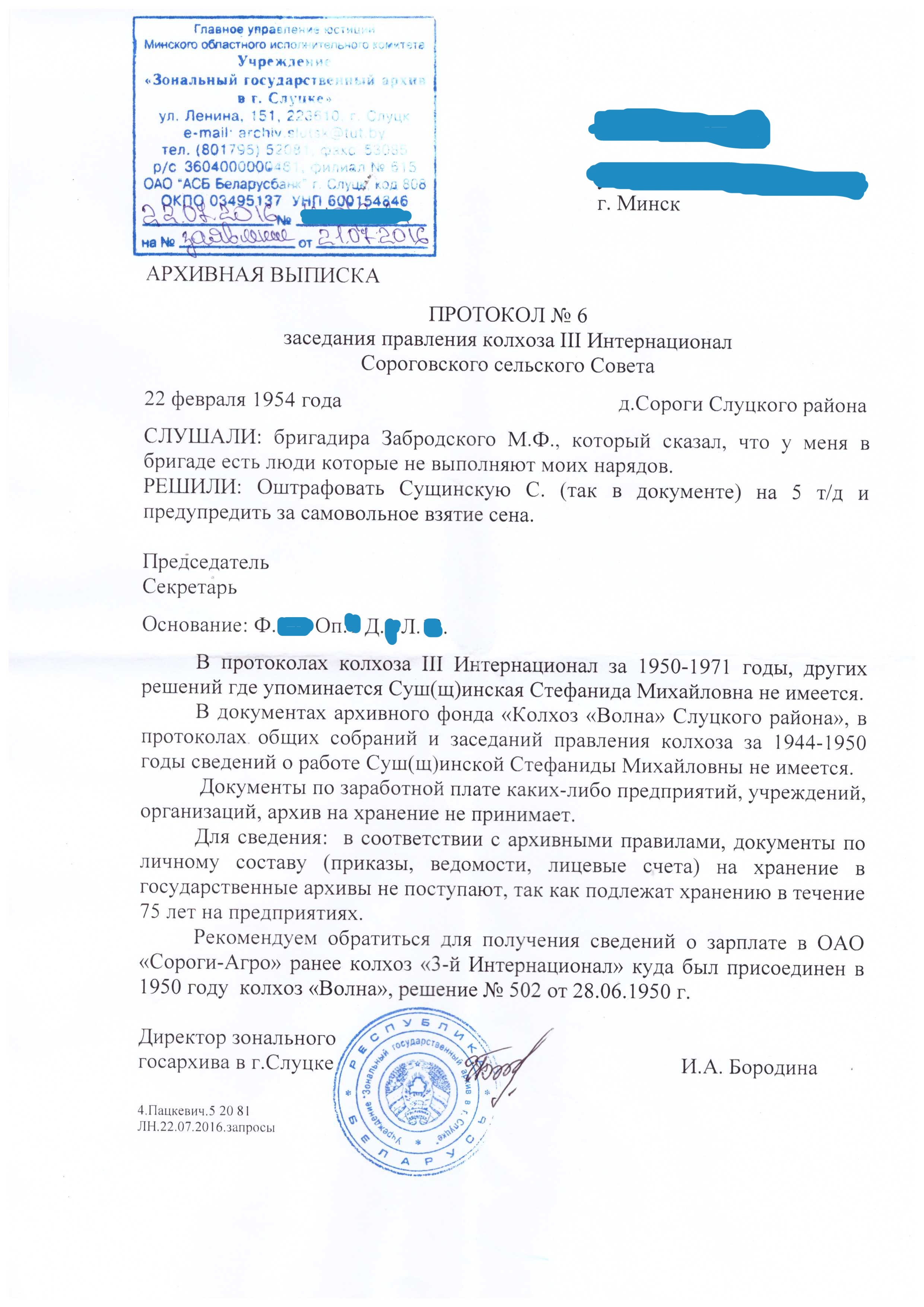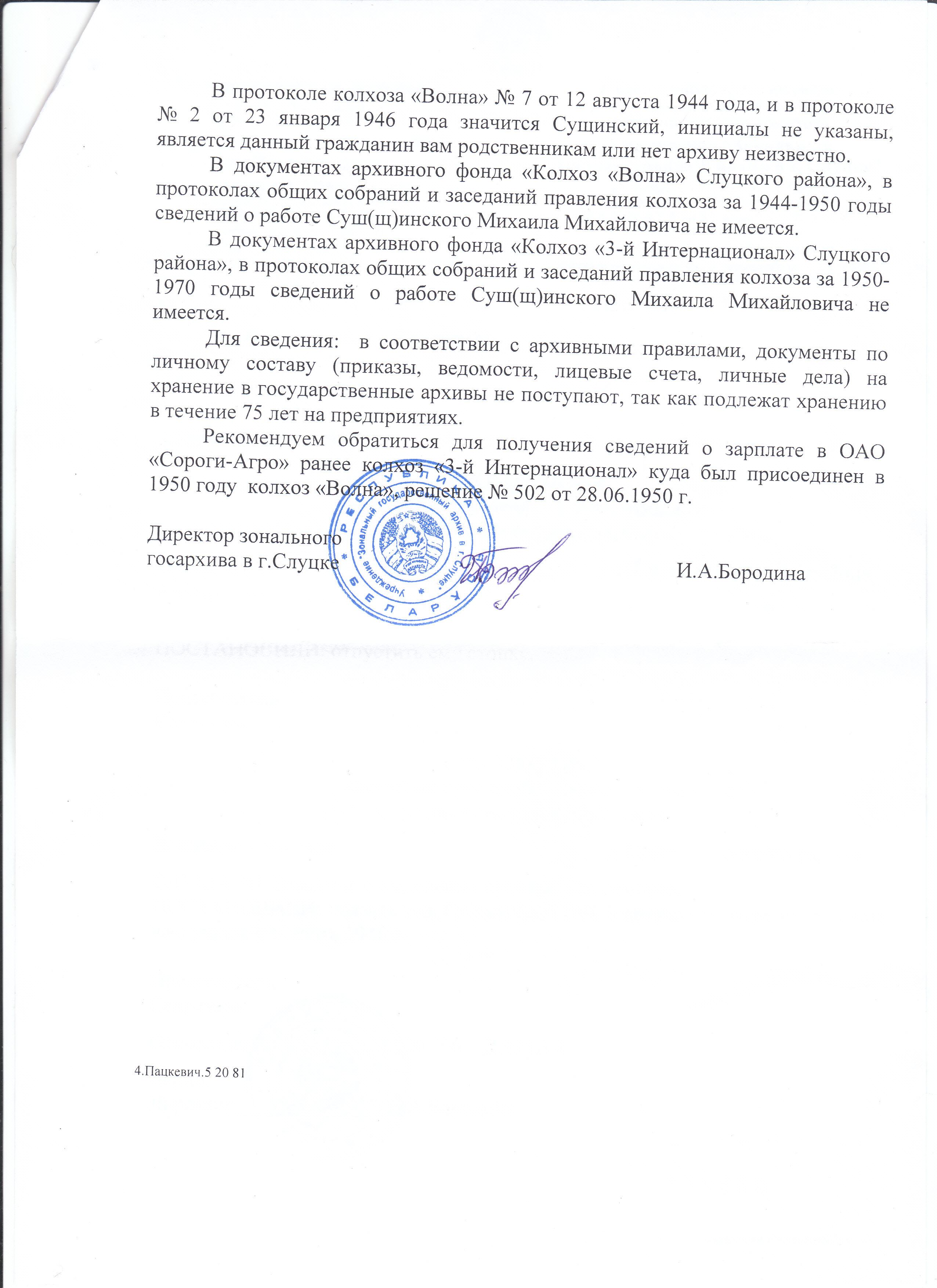 Нечто подобное нашел по деревне Круглое, но уже за 1944г по 1956г в Слуцком зональном архиве (прислали вообще бесплатно на дом. почту) Там упоминаются собрания колхозников на которых участвовала моя бабушка Стефа. Кстати она была мать героиня, так как у ее было пятеро детей. Батька мне рассказывал, что была награждена за это даже медалью. В том Слуцком зональном архиве правда ни чего не нашли про это, но я думаю что в этом архиве Минской области я что нибудь откопаю)