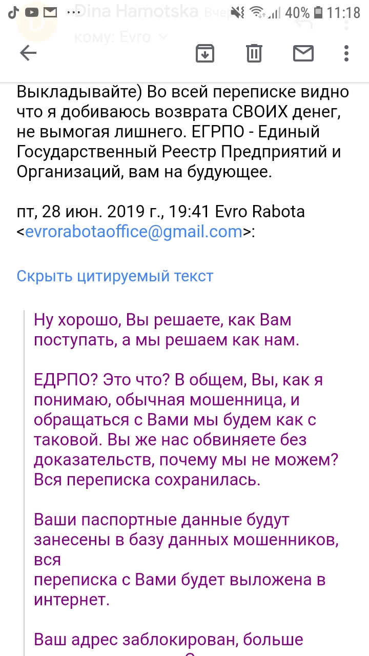 И все, я мошенница, поскольку весь день потратила на ругню и выяснения по почте с этим Борисом. даже скрин приложу, с его письмом, в котором он написал что внесет мои данные в базу данных о мошенниках. На каких основаниях?