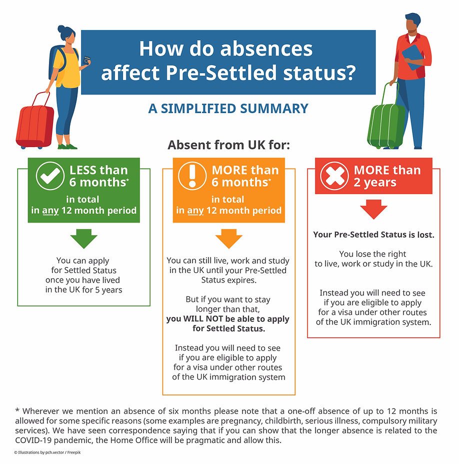 Наглядная картина. Если хотя бы в один год из пяти лет pre-settled провести за пределами UK больше полугода - то по окончании статуса уже ничего не получишь и на выход)