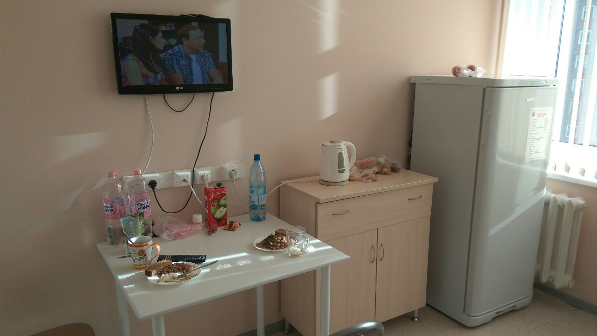 Палата на 2х человек. Чайники, телевизоры, холодильники все больничное. В фото не попали кондишин и микроволновка. Душ и туалет на 2х в палате. Кафель недорогой, рублей 600 за квадрат, но все свежее чистенькое.