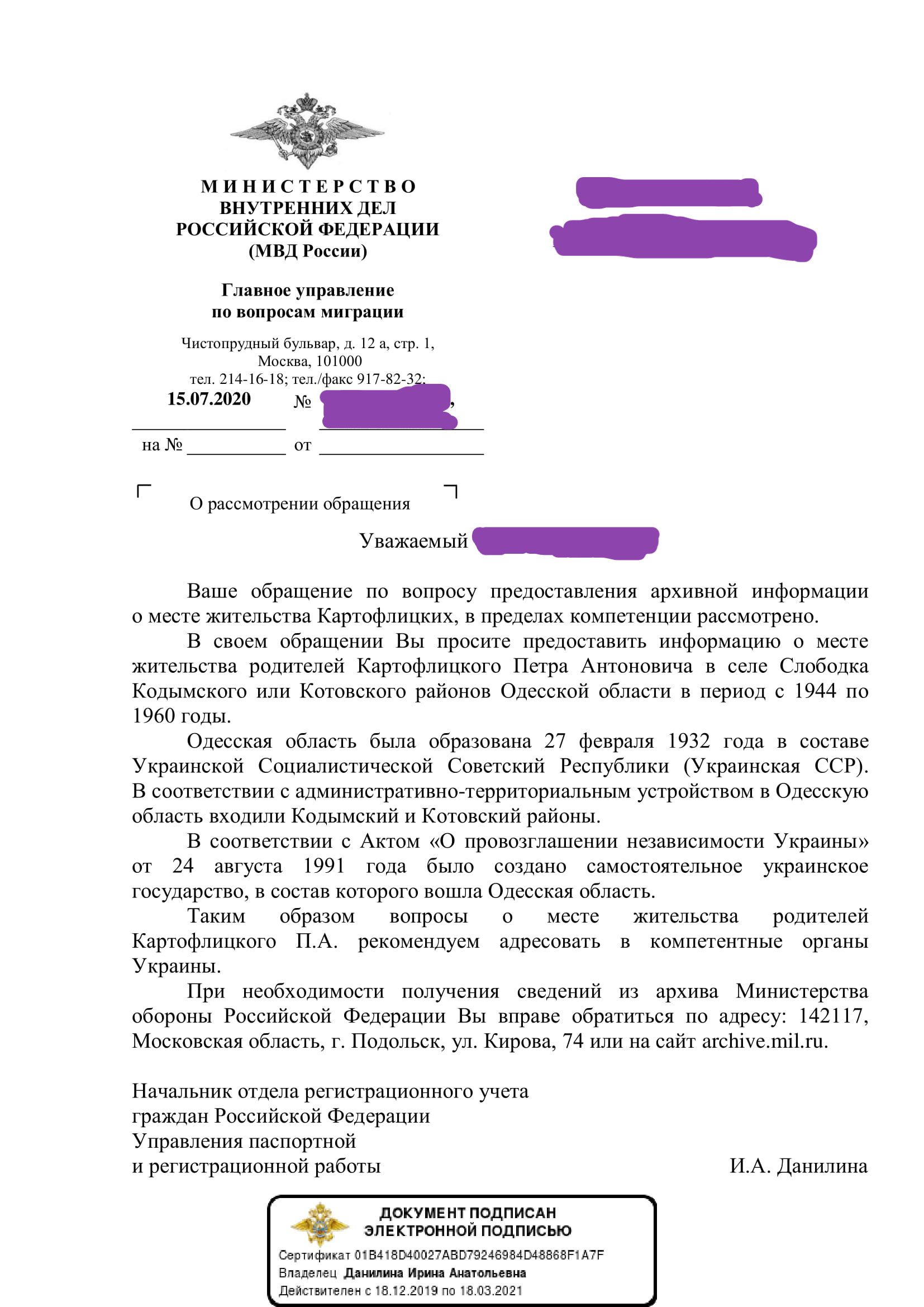 Так как об этом мне рассказали дальние родственники. Кроме того я найду их акт/записи о смерти в которых также будет указана графа национальность, и указано их место рождения, которое подтвердится с их справками о рождении, и их браке в 1900г в Флорештах!В РФ я также сейчас запросил информацию из архива Министерства обороны об адресе проживания родителей - родного брата (Петра) бабушки, и моей бабушки Анастасии.