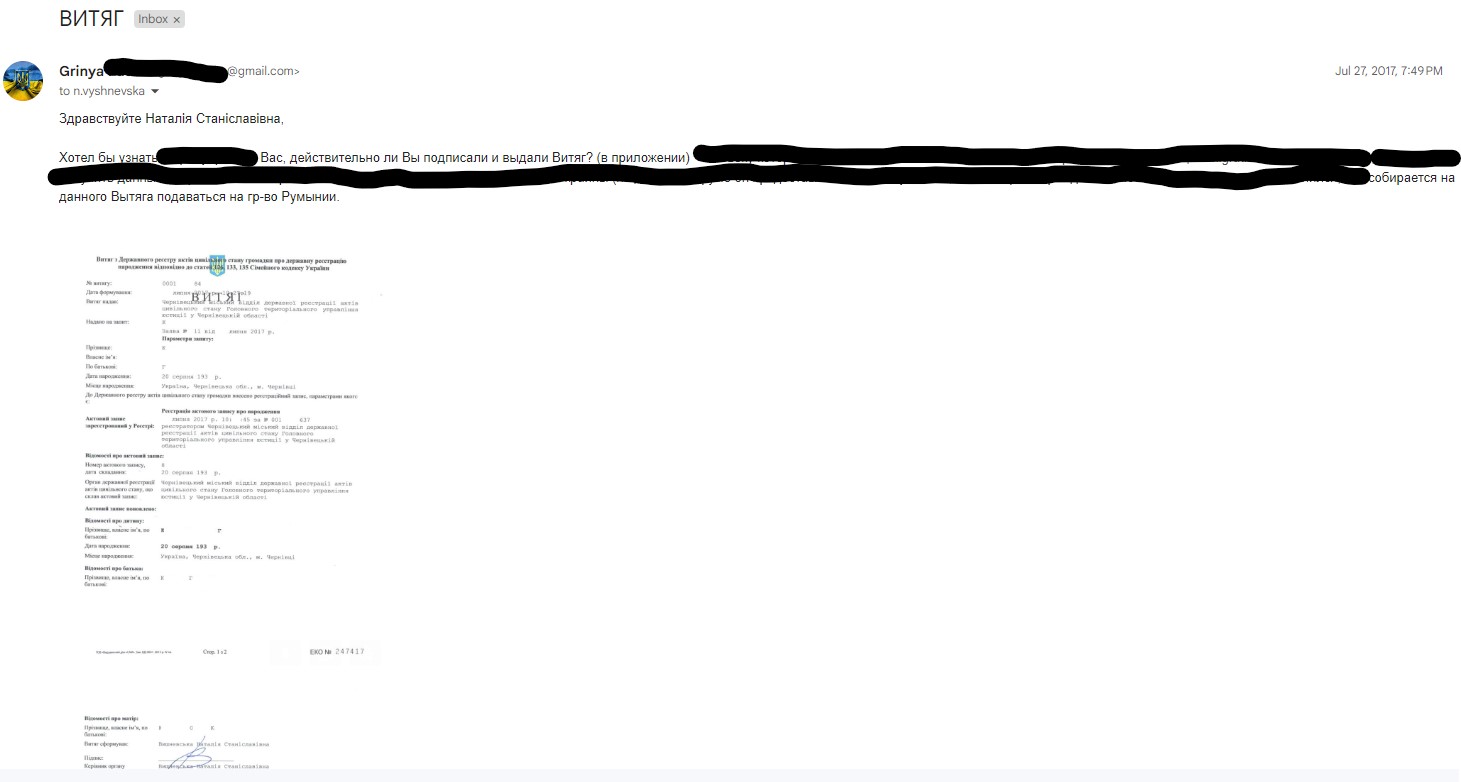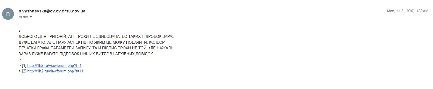 Как и раньше. Я выставил скан витяга на своего предка, подтверждающий его румынское происхождение, как знак того, что я нашел возможность получать законные документы в черновицком архиве для подачи на румынское гражданство. Тут же возник аноним, который предъявил небрежно нарисованный скан переписки якобы с чиновником ЗАГСа, как доказательство того, что выставленный мной документ-поддельный. Мне пришлось написать знакомой мне чиновнице ЗАГСа, где я подавал заявление для получения "витяга" для того, чтобы в ответе мне она подтвердила подлинность моего документа. Скан этого ответа я также выставил на форуме, как доказательство подлинности моего витяга...