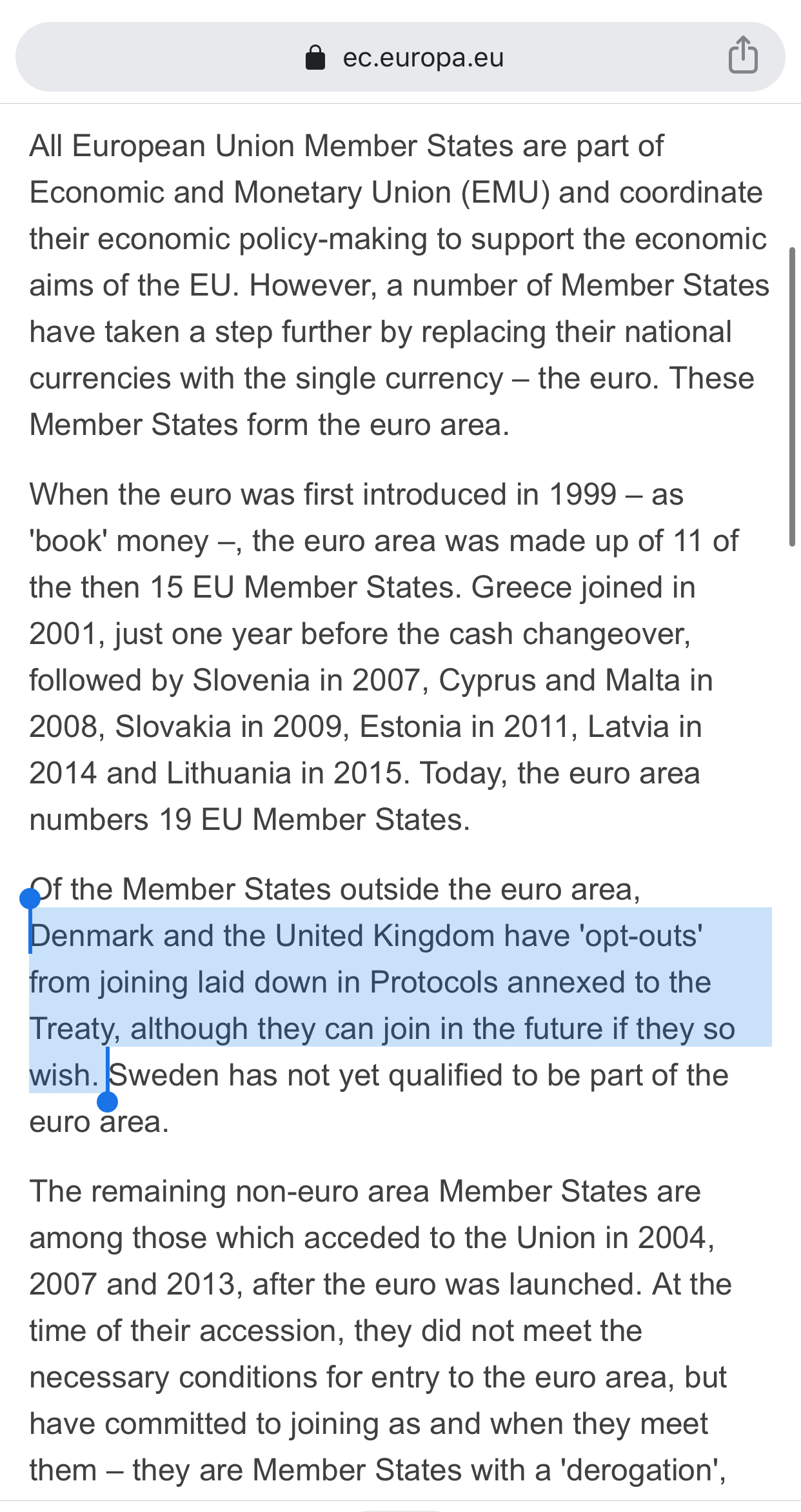 Швеция не может поменять свою конституцию, Дания и Великобритания отказались от евро на начальном этапе (и в Дании проблема в населении, которое на референдуме отказывает правительству в евро), а Польша, Чехия и всякие там Венгрии попросту реализуют фразу моей бабули. Не хотят и не будут. Хоть говори, хоть насери, как говаривает моя тёща.