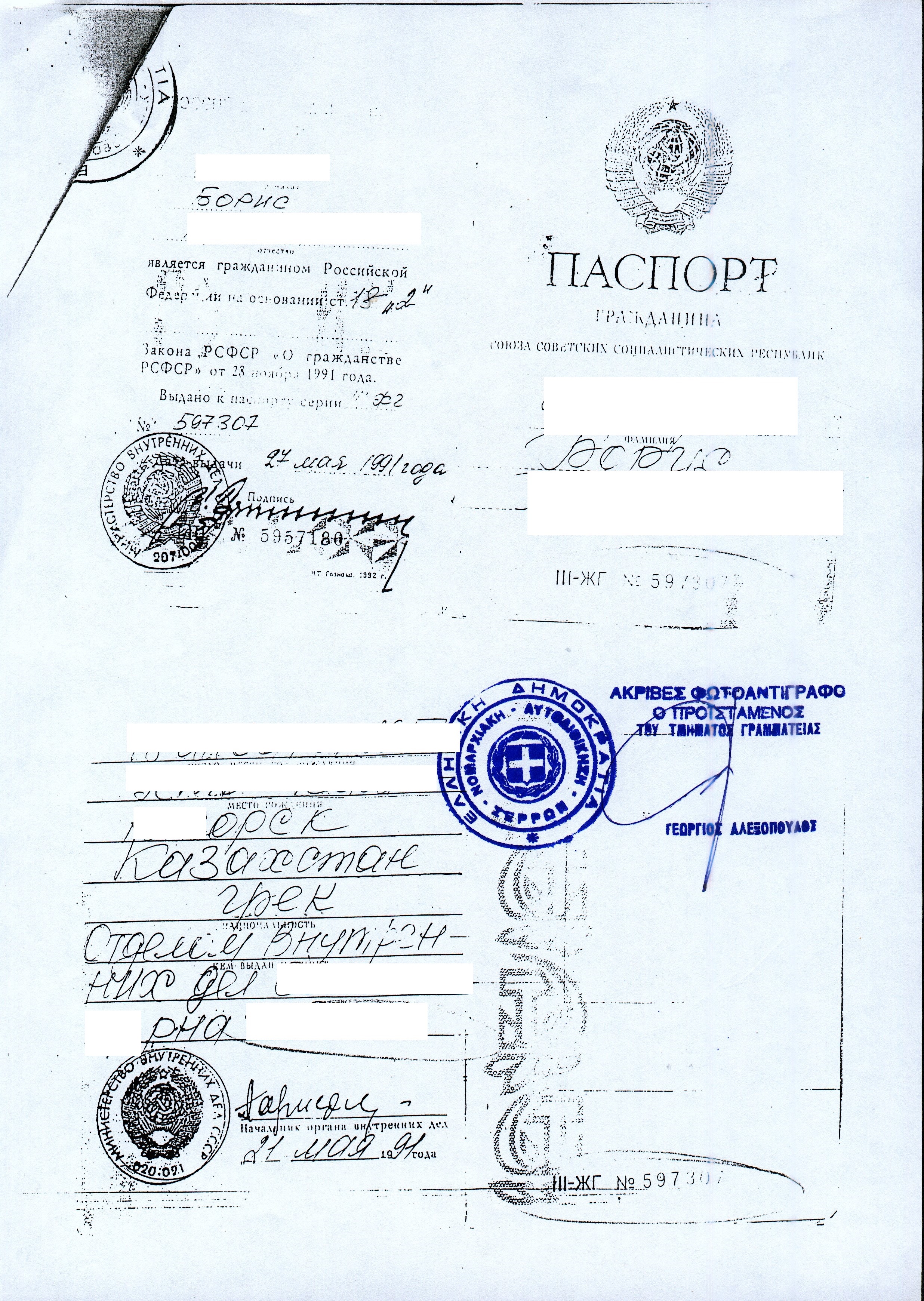 В вашем случае - это просто вами сделанная ксерокопия вашего паспорта из дела на получение того "прямого , как стрела", греческого гражданства, которого вас потом лишили (сразу видно тертого специалиста-даже себе не смог сделать). Очень может быть, что левак, так как гражданство было аннулировано по неизвестной причине (если только Консул Греции вам за рюмкой Метаксы об этом не поведал лично