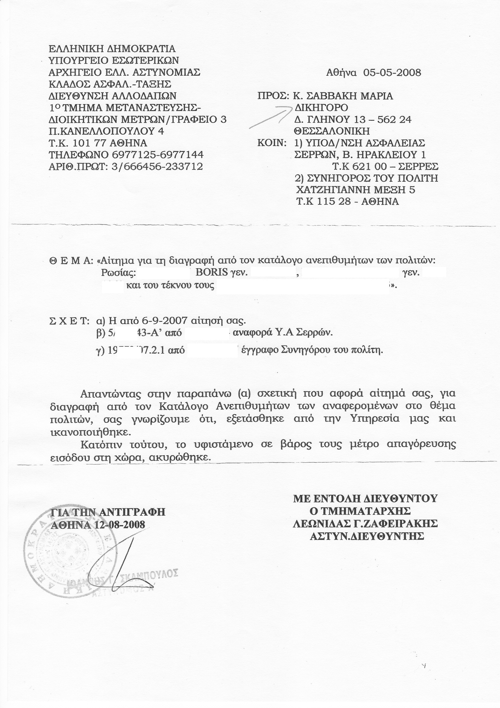 Не помню в который раз выставляю тут скан решения МВД Греции от 12.08.2008 г. об отмене решения о лишении меня гражданства и исключения из списков т.н. "нежелательных иностранцев".