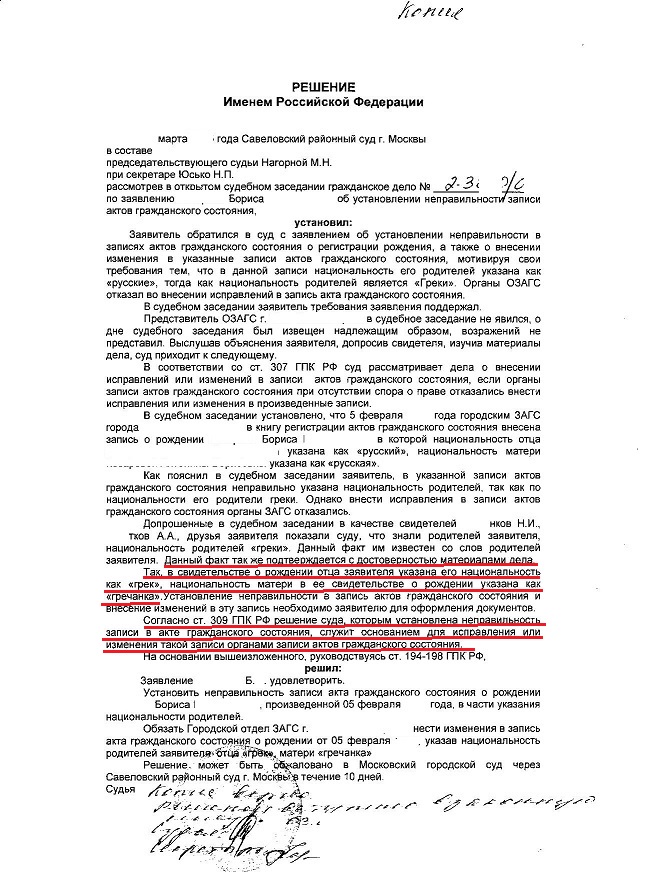 Раз уж даже "специально" для любителей, то как любитель конкретики выставляю тут свое собственное любительски полученное решение Савеловского районного суда г. Москвы, согласно которого суд обязал орган ЗАГС по месту регистрации моего рождения внести изменения в актовую запись о рождения в части национальности родителей: с "русские" на "греки":