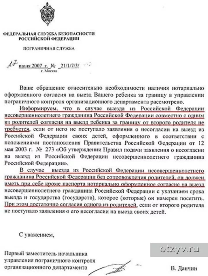 В случае выезда из Российской Федерации несовершеннолетнего гражданина Российской Федерации совместно с одним из родителей согласия на выезд ребенка за границу от второго родителя не требуется, если от него не поступало заявления о несогласии на выезд из Российской Федерации своих детей, оформленного в соответствии с требованиями постановления Правительства Российской Федерации от 12 мая 2003 г. № 273 «Об утверждении Правил подачи заявления о несогласии на выезд из Российской Федерации несовершеннолетнего гражданина Российской Федерации».