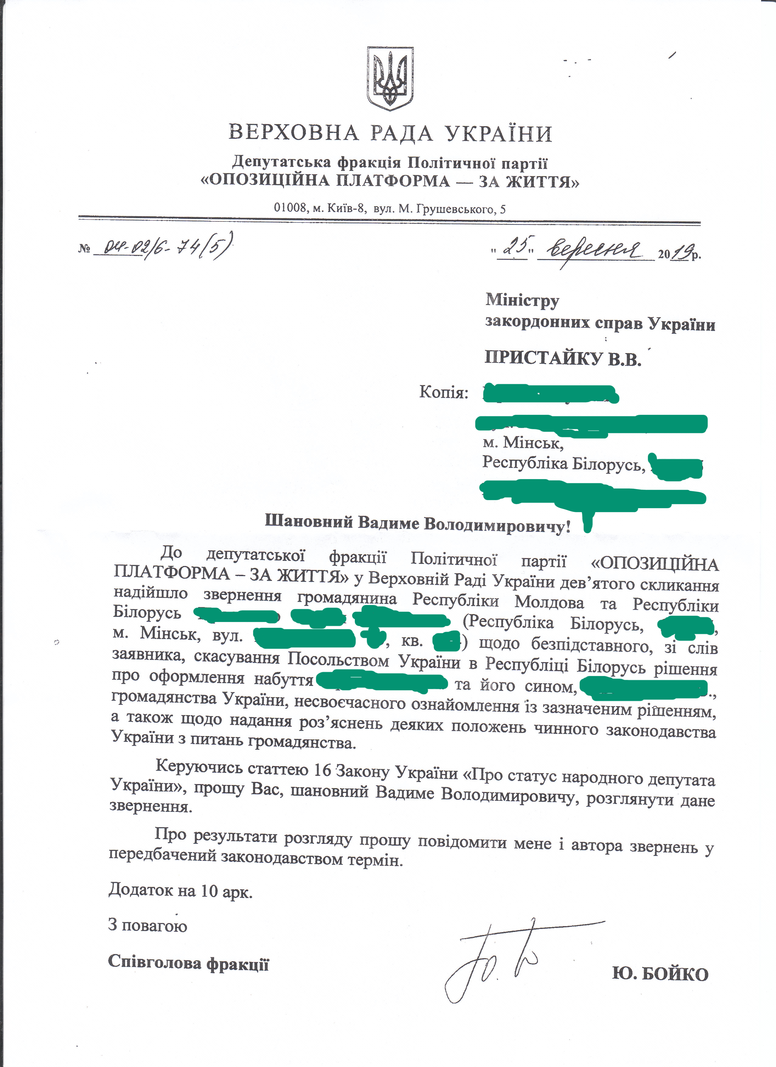 За результатами розгляду Вашого звернення від 29 серпня 2019 року, яке надійшло з Апарату Верховної Ради України листом від 30 серпня 2019 року №ХХХХ.26.19/835-08.19-П (вх. №ХХХ.26.19/835-08.19-П від 02 вересня 2019 року) щодо набуття громадянства України Вами та вашим сином повідомляю, що питання, порушені у вашому зверненні, не входять до повноважень народних депутатів України.