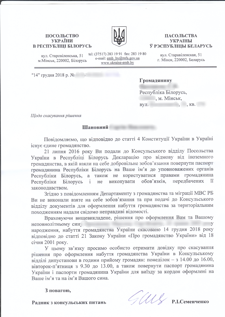 Получил сегодня из посольства Украины информационное письмо о том, что мне и моему сыну отменено гражданство Украины на основании того, что я якобы не выполнил взятое и подписанное мною в декларации "об отказе от прошлого гражданства" (на основании заполнения пункта № 5 об превышении выхода из гражданства РБ более половины МРОТ Украины, я освобождён по закону от выхода из гражданства РБ) речь идёт про обязательство о возврате моего паспорта РБ в компетентные органы РБ.