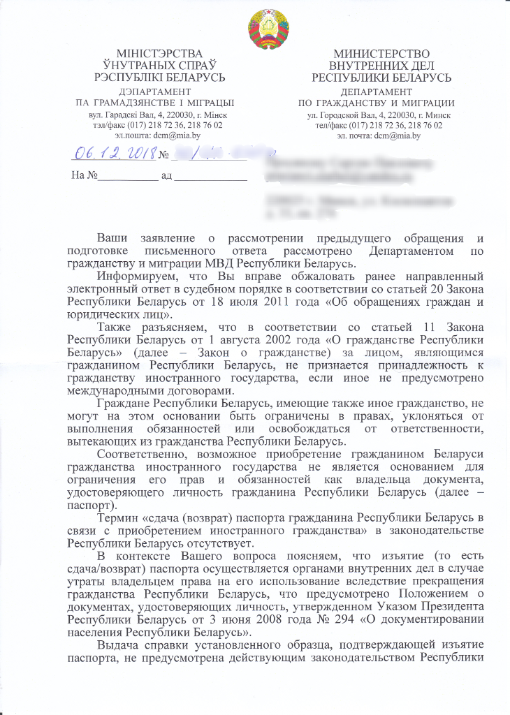 Вот ответ Депортамента МВД РБ по гражданству и миграции...