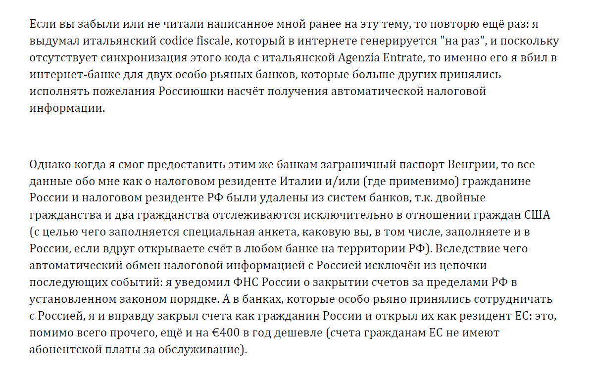 К автоматическому обмену налоговой информацией это не имеет ни малейшего отношения: налоговые органы "той, другой страны" не обязаны уведомлять Россию о наличии у своего гражданина счетов в банках: у России отсутствует институт двойного гражданства в отношении любой страны, кроме Республики Таджикистан. Это означает, что каждая из стран гражданства конкретного лица рассматривает лицо как только своего собственного гражданина (в отношении стран ЕС они все обязаны рассматривать гражданина ЕС и РФ как гражданина ЕС).