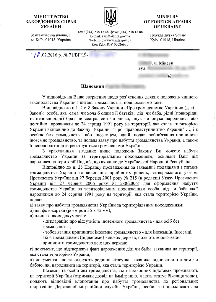 После этого я дома написал обращение в МИД Украины, и получил ответ о том, что я имею право на оформление гражданства Украины...этот ответ выложил выше))