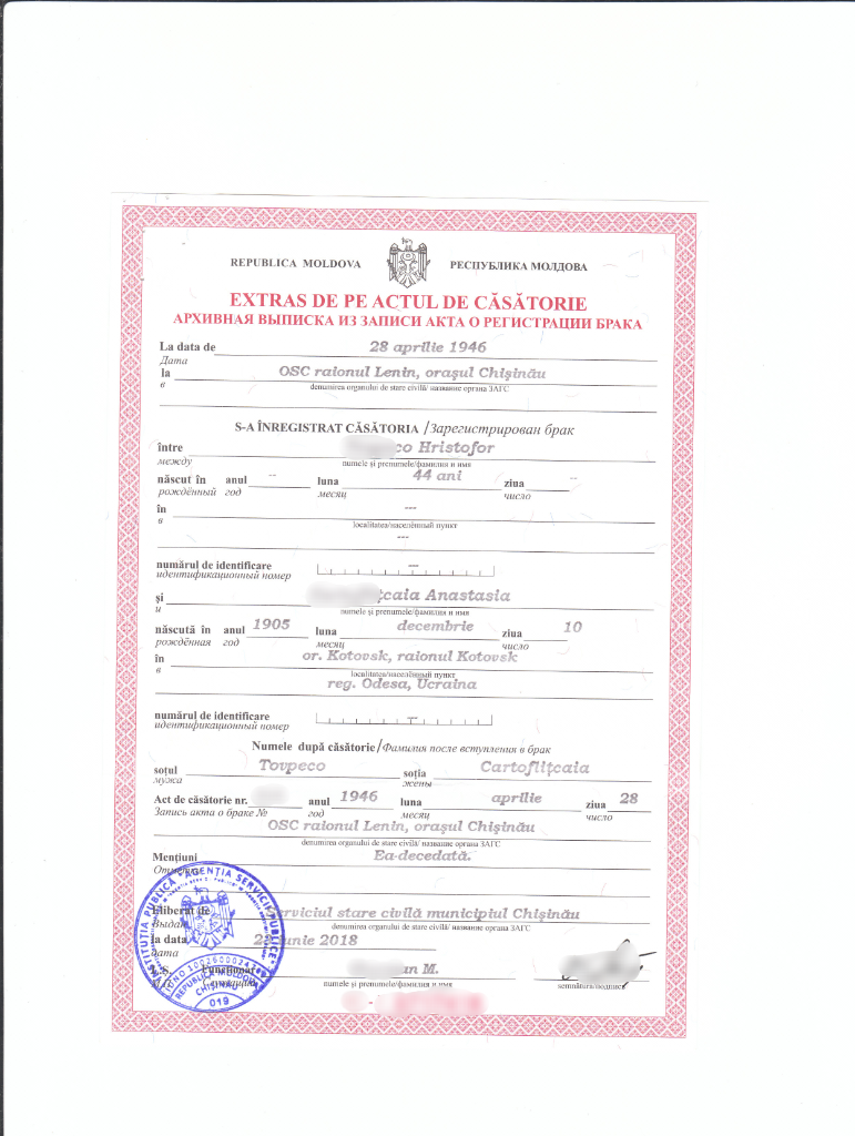 Парашенко, хватит позорить мою Родину Украину в глазах стран международного сообщества, которые пристально наблюдают за всем этим «законодательством», и как уже целых пять лет «продвигаются реформы» в Украине! Уходи в отставку!Отправлено спустя 1 час 28 минут 2 секунды:получил в ЗАГС Минска такую архивную справку (выписку) из Брака бабушки в Кишинёве от 1946г. Там наконец то внесли в графу её место рождения "Котовск, Котовский район, Украина"