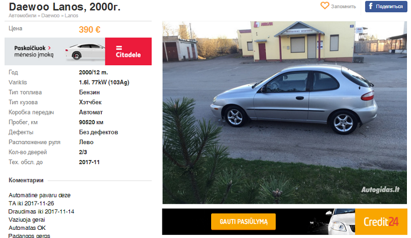Но встречаются разные варианты. Например, вот этот 3-дверный хэтчбек Ланос 2000 года с автоматической КПП оценен в 390 евро!