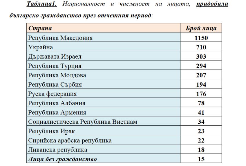 Приобретение гражданства: 3 631, в т.ч. по болгарскому происхождению (включая детей от болгарского родителя): 3 380.
