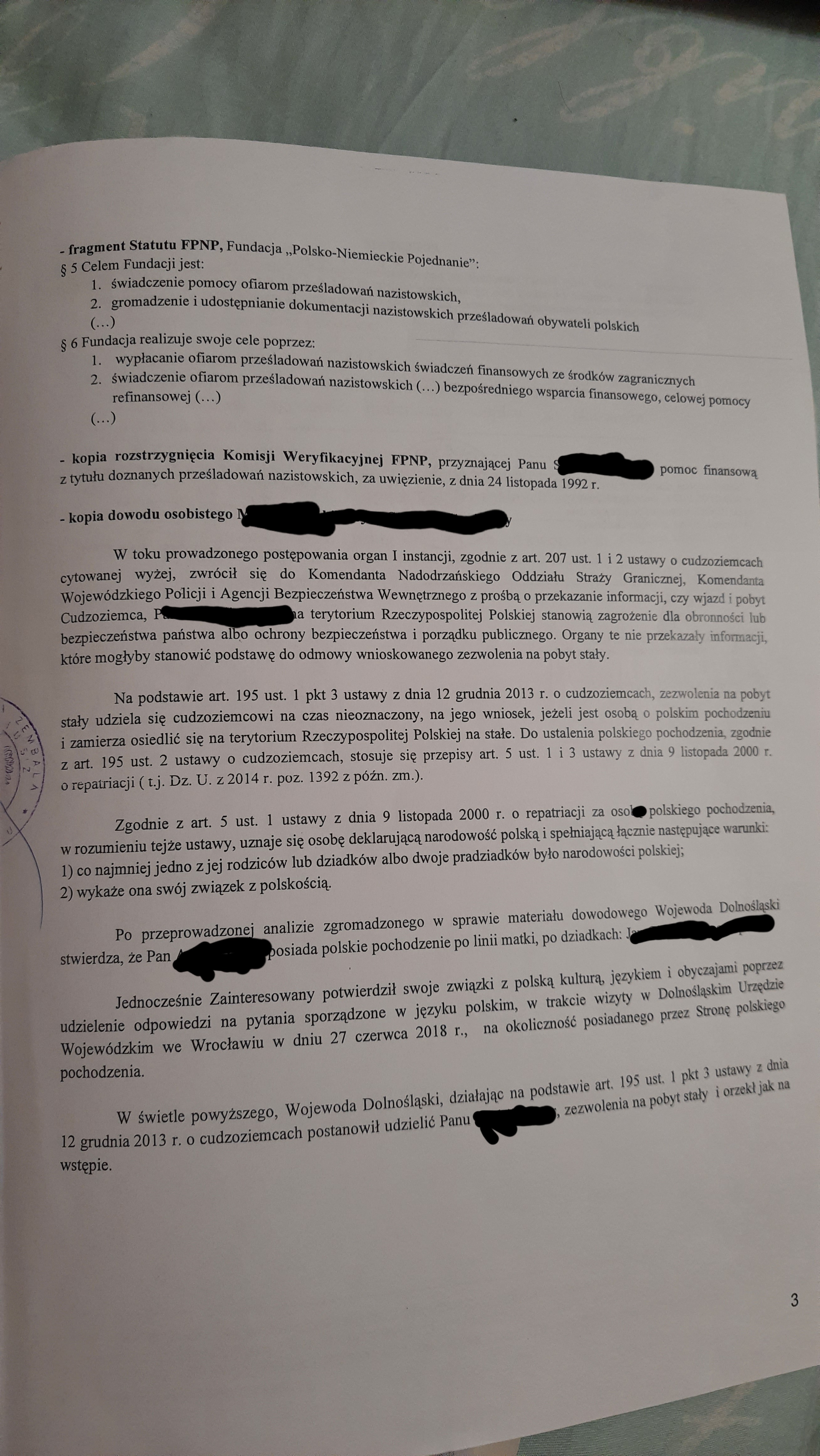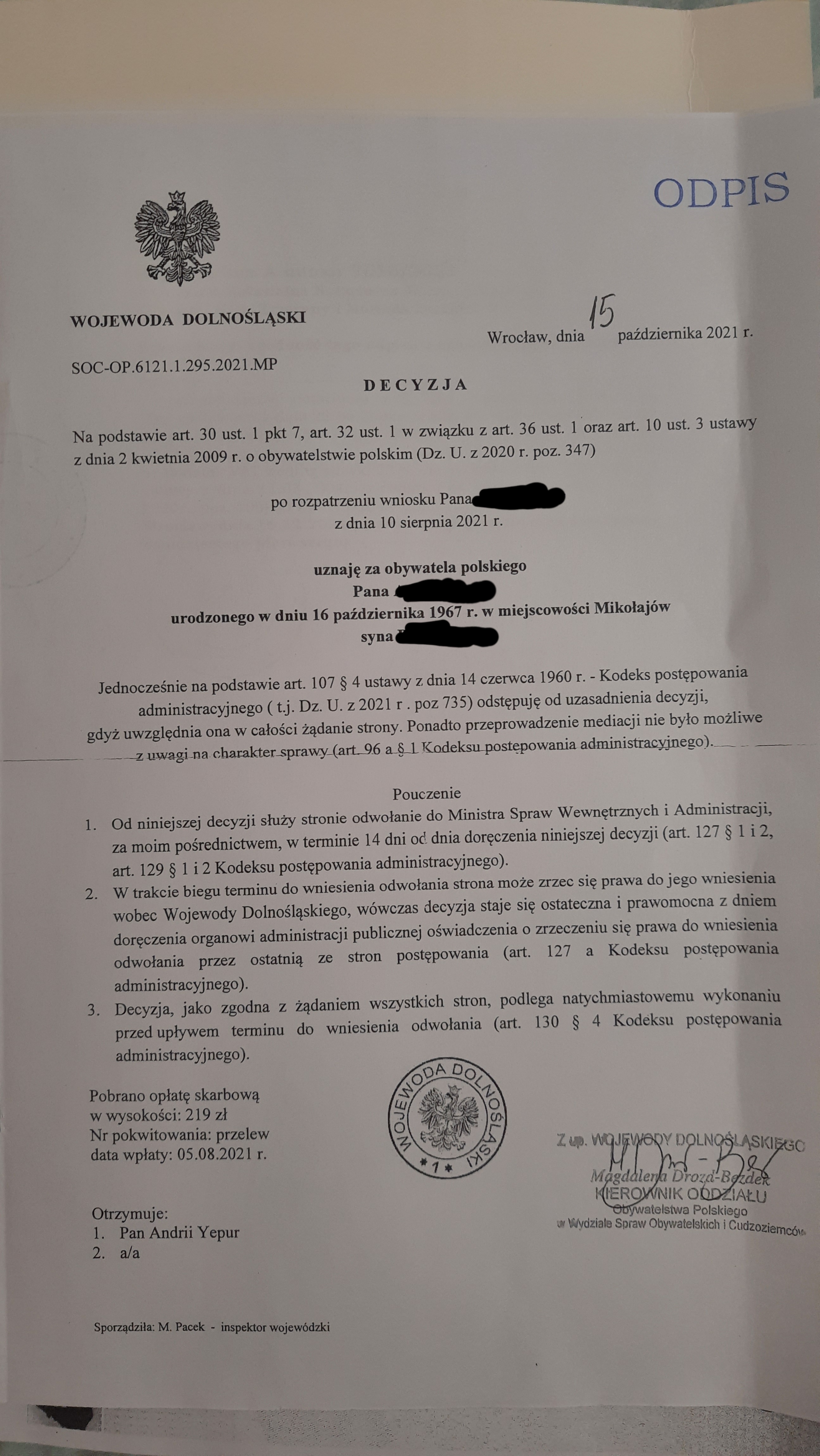 Добрый день, меня зовут Игорь и мне 32 года, ситуация следующая: мой отец получил сперва децизию Вроцлавского воевудства о признании его поляком по корням (документов было много, но все слабые), на основании чего он получил сталый побут. Позднее он получил децизию на получение гражданства Польши и получении польского свидетельста о рождении и паспорта и успешно их получил. На данный момент у меня на руках есть все документы благодаря которым мой отец стал гражданином Польши, все децизии, все его документы. Могу ли я претендовать на карту поляка, если мой отец ее не получал? Если могу, то к какому пункту закона мне апелировать? Возможно нужно подключить юриста для составления правильного юридически грамотного письма в консульство и построении стратегии поведения в консульстве? Живу в Украине г. Николаев. Буду благодарен за любую информацию. Наверное важным будет сказать, что при моей первой попытке (тогда была децизию о признании отца поляком по корнях), меня завалили, сказали, что отец, это конечно хорошо, но к Вам это не относится, доказывайте свой статус самостоятельно, ну а Вы понимаете, что если у моего отца были слабые основания, то у меня их практически нет, а так же засыпали вопросом о годах репатриации моих родственников, на что я сказал дату и меня завернули. Возможно правильным было бы сказать, что не в курсе. Хотя мое знание польского оценили высоко.