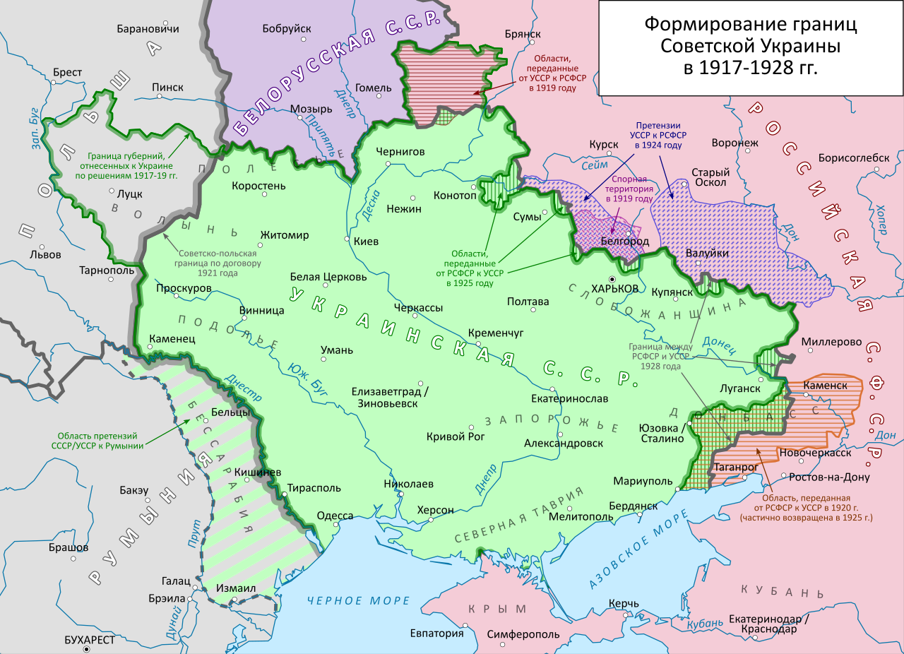 Карта УССР с обозначенными спорными территориями к РСФСР до 1924г...как раз там и родился мой дед.
