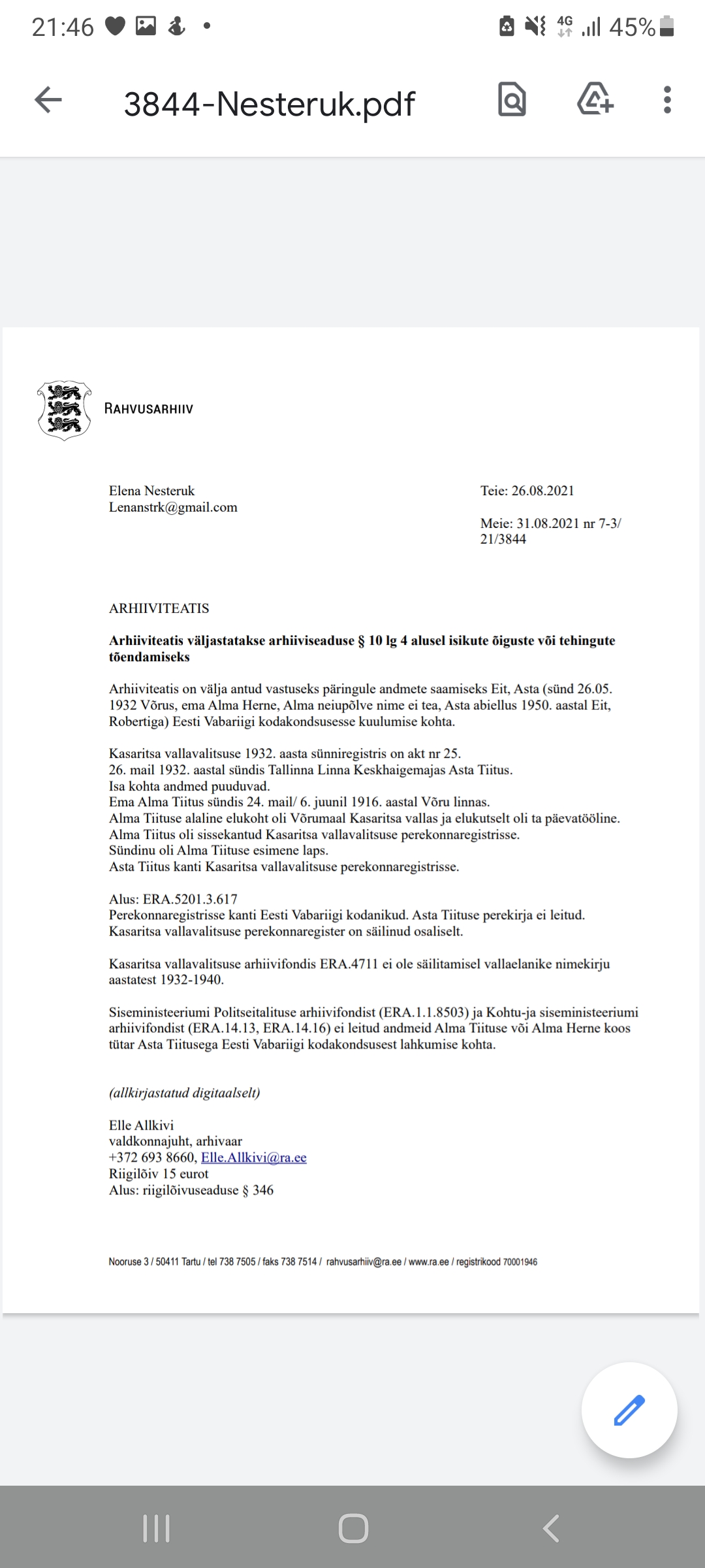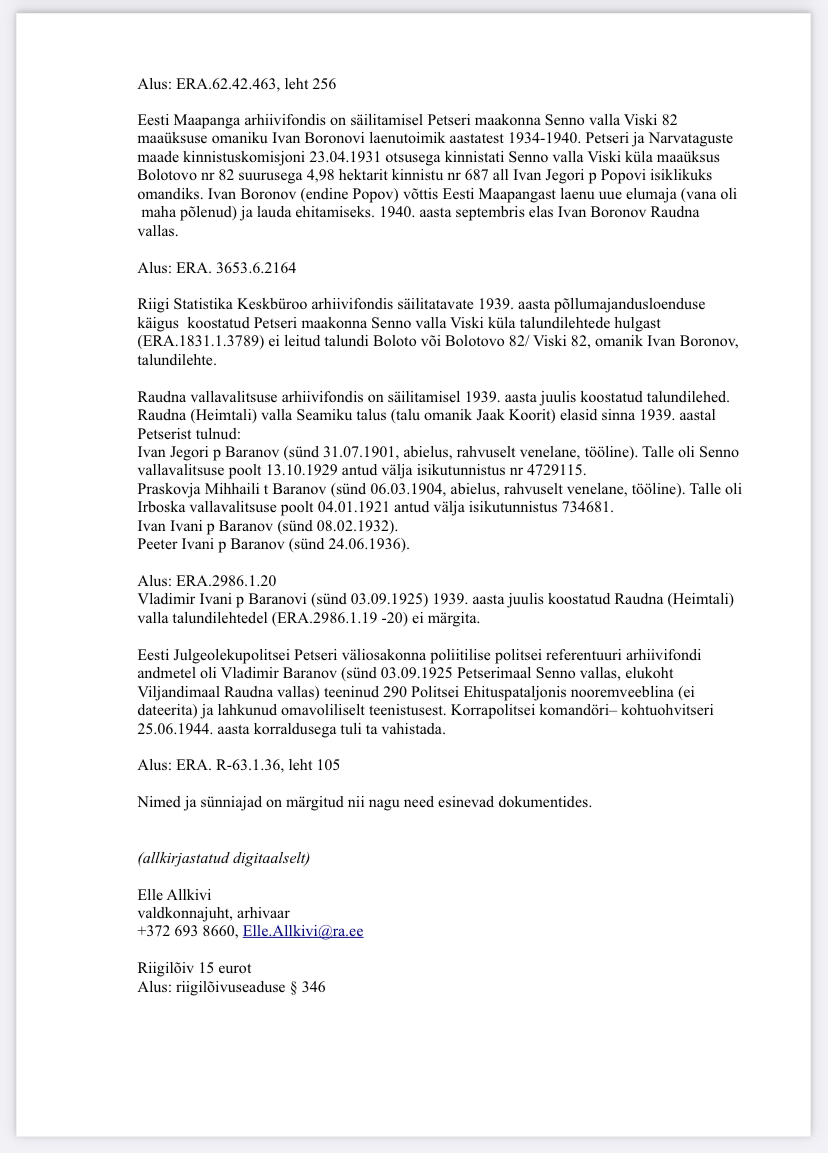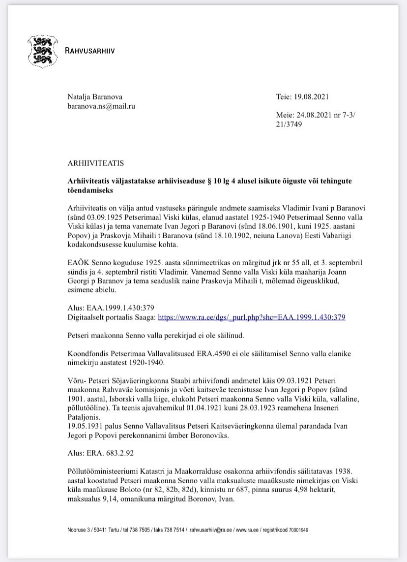 Архивное уведомление выдано в ответ на обращение о предоставлении данных о Владимире Ивановиче Баранове (родившемся 03.09.1925 в поселении Виски Печорского уезда, проживавшем в 1925-1940 годах в Виски, волость Сенно Печорского уезда) и о его родителях Иване Егоровиче Баранове (родившемся 18.06.1901, до 1925 года имевшем фамилию Попов) и Прасковье Михайловне Барановой (родившейся 18.10.1902, девичья фамилия – Ланова) на предмет принадлежности ко гражданству Эстонской Республики.
