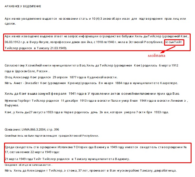 perec писал(а):Источник цитаты Такие , что если у гражданки ПЭР родилась дочь - это и будет доказательством ее гражданства. Если нет, то пра-пра-пра предки не помогут. Инспекторы РРА не будут вникать в хитросплетения судеб и людей при царе горохе , они действуют по инструкции - есть подтверждение наличия гражданства из эстонского архива + подтверждение родства - есть гражданство у потомков, нет данных - нет гражданства.