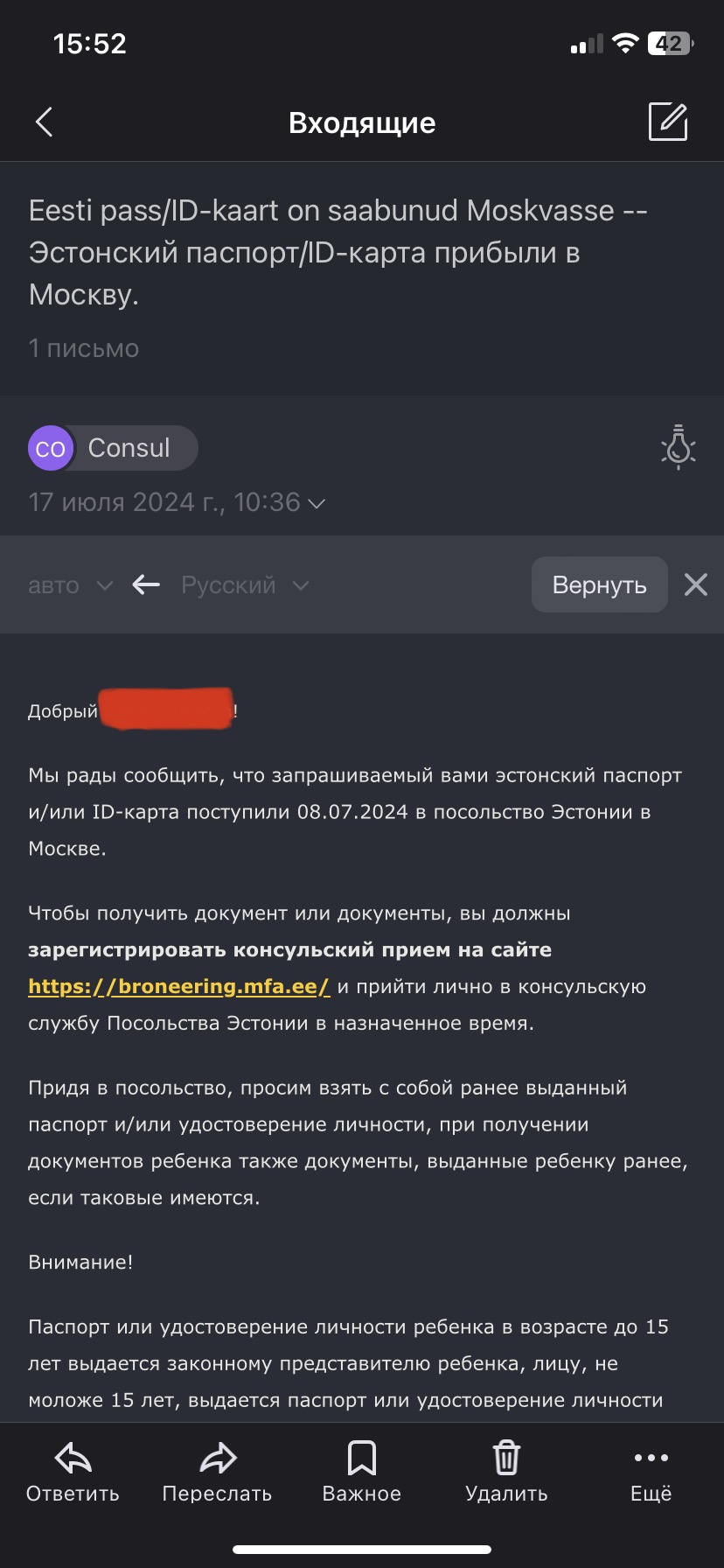 4. Документы приехали в Москву спустя 24 дня, но уведомление об этом пришло еще через 9 дней, итого с момента одобрения до уведомления о готовности документов прошло 33 дня.