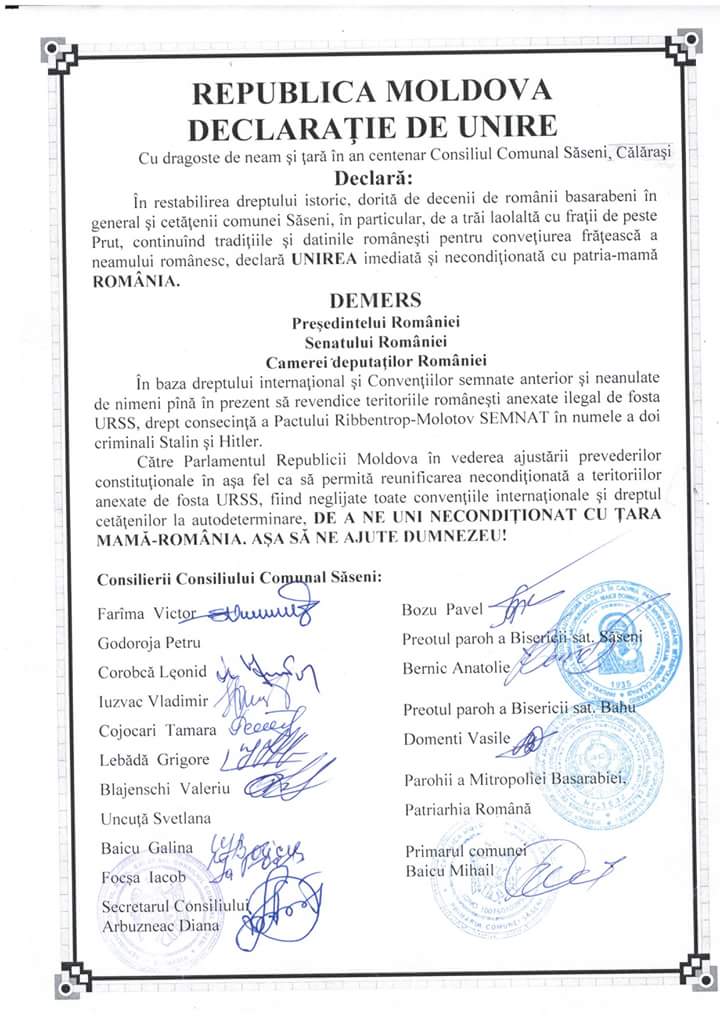 В Румынии существует план «Униря-2018» («Объединение-2018»). Недавно в Бухаресте была озвучена инициатива создать специальное министерство воссоединения. Бывший румынский президент Траян Бэсеску, активно занимающийся молдавской политикой, планирует участвовать в парламентских выборах в Молдове в нынешнем году как почетный председатель Партии национального единства. Мешает этому то, что Бэсеску лишили полученного ранее гражданства РМ. Это было сделано президентом Молдавии Игорем Додоном и подтверждено решением кишиневского суда. Но Бэсеску надежду на возвращение молдавского паспорта не теряет и приветствует парад деклараций молдавских сел. Он считает, как сообщают молдавские СМИ, что это может послужить основой для возвращения Молдавии в Румынию. Процесс, похожий на возвращение Крыма в Россию. Но если Крым ни Бухарест, ни Кишинев российским не признали, то свое – родное воссоединение приветствуют и оправдывают заранее.