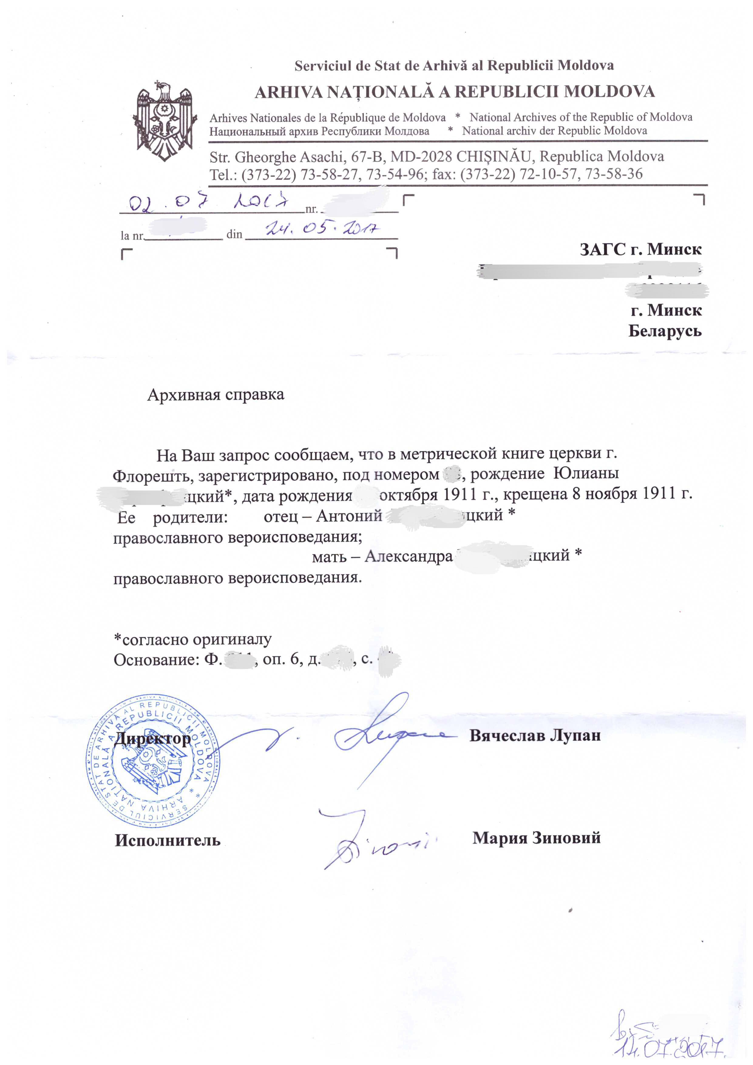 Кто что скажет по поводу вот этого документа недавно полученного мною на руки - это справка о рождении родной сестры моей бабки, рождённая в г. Флорешты (Бессарабия) Молдова? На что можно претендовать если моя бабка родилась в г. Бирзула (Котовск, Подольск), Одесская область МАССР? Родители у их выходит общие, прадед был железнодорожником, поэтому и перемещался на такие расстояния, что дети рождались в разных местах.