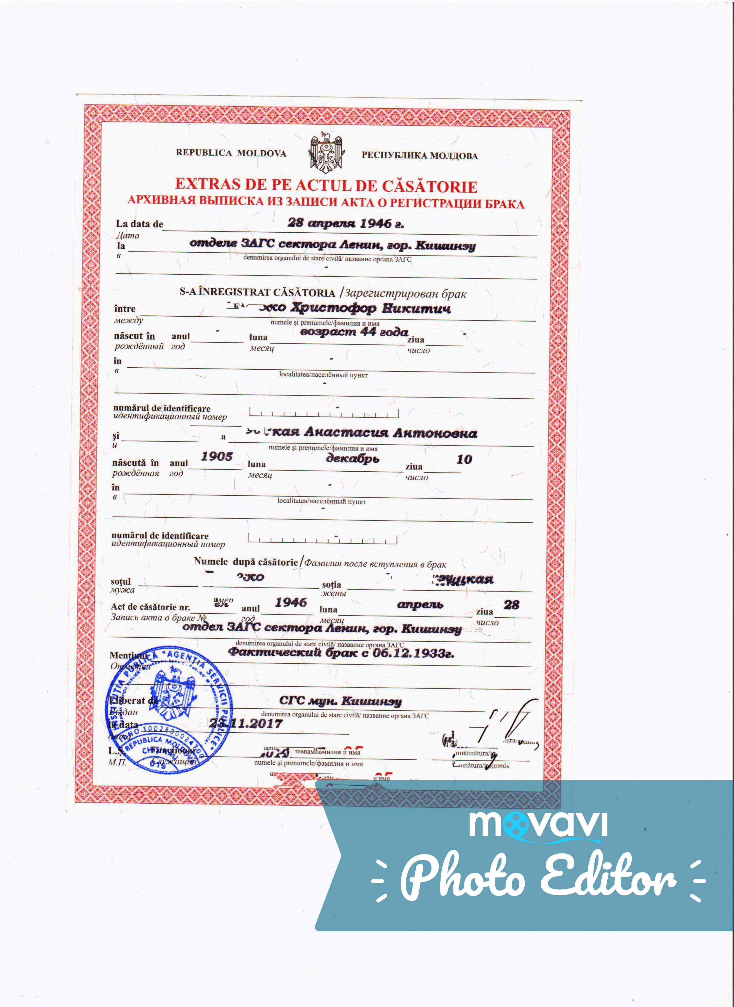 Но и то, и здесь у меня для румын есть документик: Кишинёвский СОБ бабки от 1946г в котором указана ссылка, что в фактическом браке она находится с 6 декабря 1933г. Этого что тоже мало, ведь эти данные не я написал ей в актовую запись?))