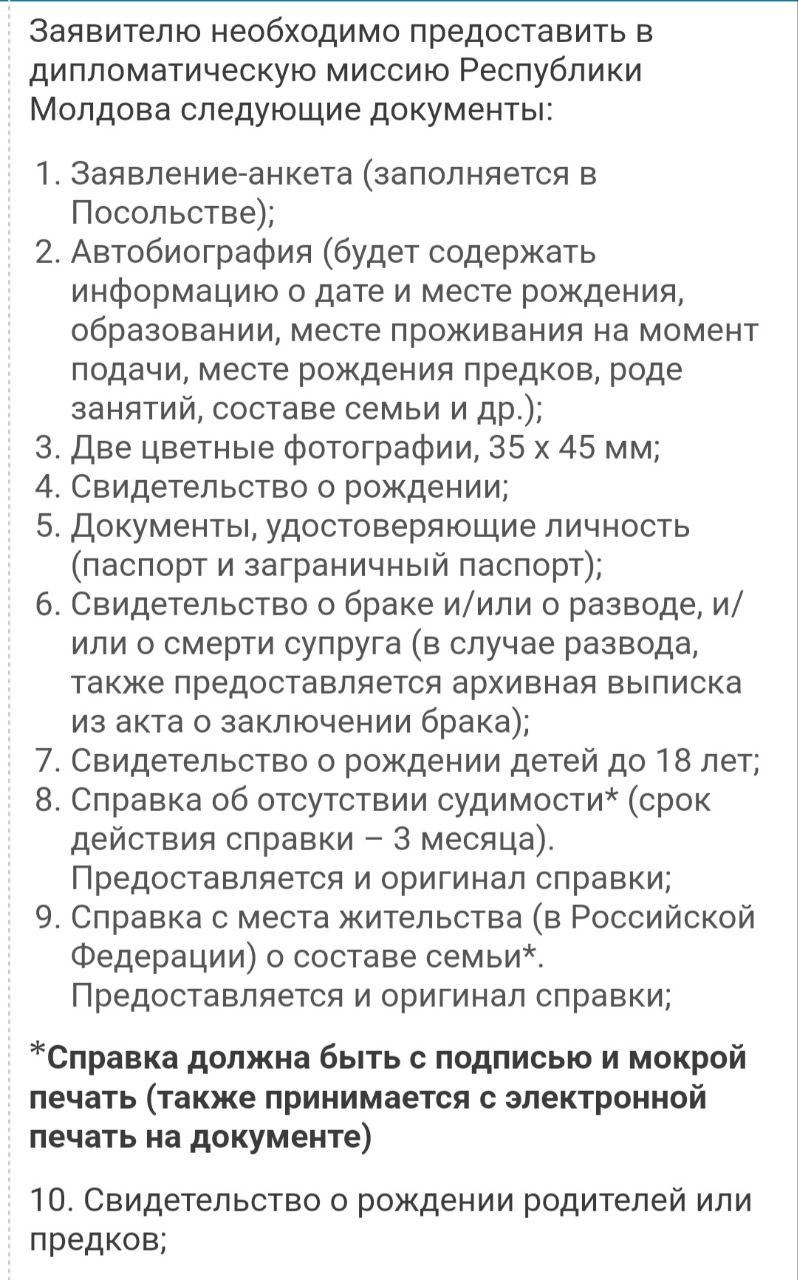 Я бы хотела получить гражданство Молдовы, но путаюсь в том, как всё правильно делать. Пока что успехи закончились тем, что на сайте посольства в Москве нашла список документов (см. вложения) и путем общения с парой человек из Молдовы убедилась в том, что действительно имею возможность получить гражданство по корням.