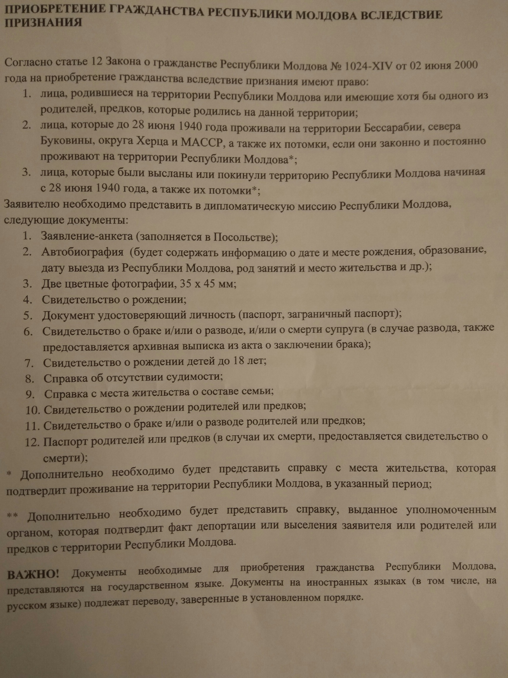 Итак, вводная следующая: моя мама родилась в 1965 году в Молдавской Советской Социалистической Республике (МССР), мой дед там же в 1936 году, но на тот момент республика называлась Молдавская Автономная Советская Социалистическая Республика (МАССР). Мама в 1986 году переехала в Россию и при смене фамилии (при регистрации брака) ей вместо молдавского паспорта выдали российский. Собственно я родился уже в России. Гражданство буду получать путем признания через маму. Также у меня, возможно, есть румынские корни у деда и прадеда (я этим занимаюсь отдельно), но это пока выглядит маловероятно и это тема для другой ветки, поэтому если что-то прояснится, то я создам новую тему, а в этой сделаю ссылку.