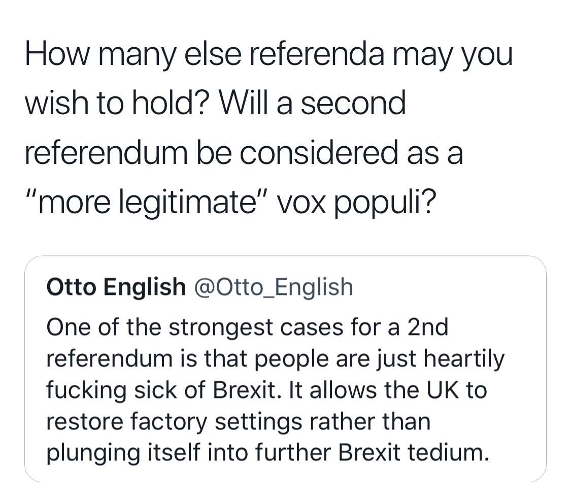 Я на днях смотрел парламентские дебаты по этому поводу, там о том, что Мэй тянет время, только ленивый не говорит на протяжении 5 часов. Проблема в том, что говорить - говорят, а действий никто предпринимать не хочет. Сейчас каждая собака критикует Мэй за то, что она не хочет проводить второй референдум, но никто не хочет на её место. Никто не хочет быть "Британским Горбачевым". Даже Лейбористы имеющие все шансы объявить Мэй вотум недоверия и сформировать правительство.