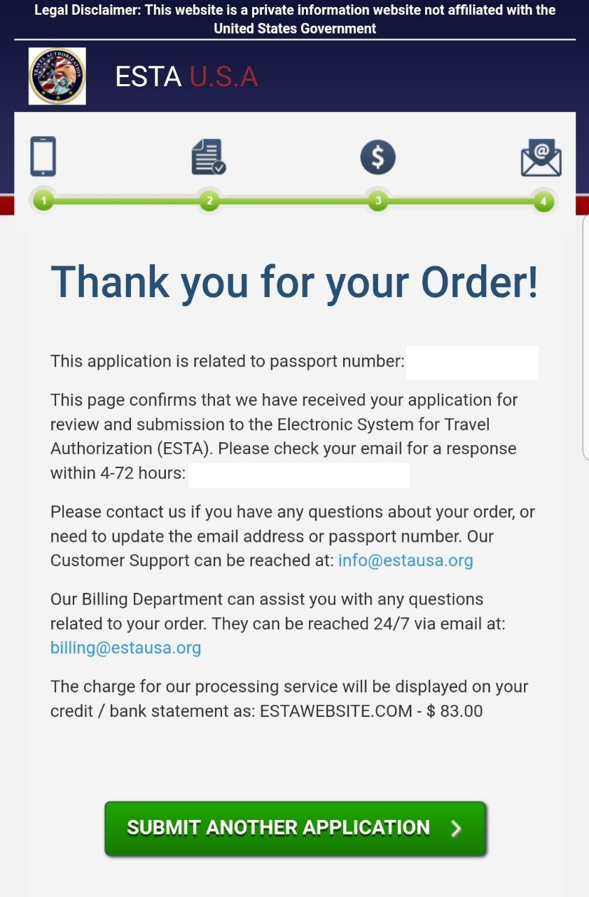 Все остальные сайты - клоны и двойники, в т.ч. и этот - http://www.esta.us/ Вы понимаете, что что-то не так, после того, как он пытается списать вместо положенных 14 долларов - 83 доллара США.