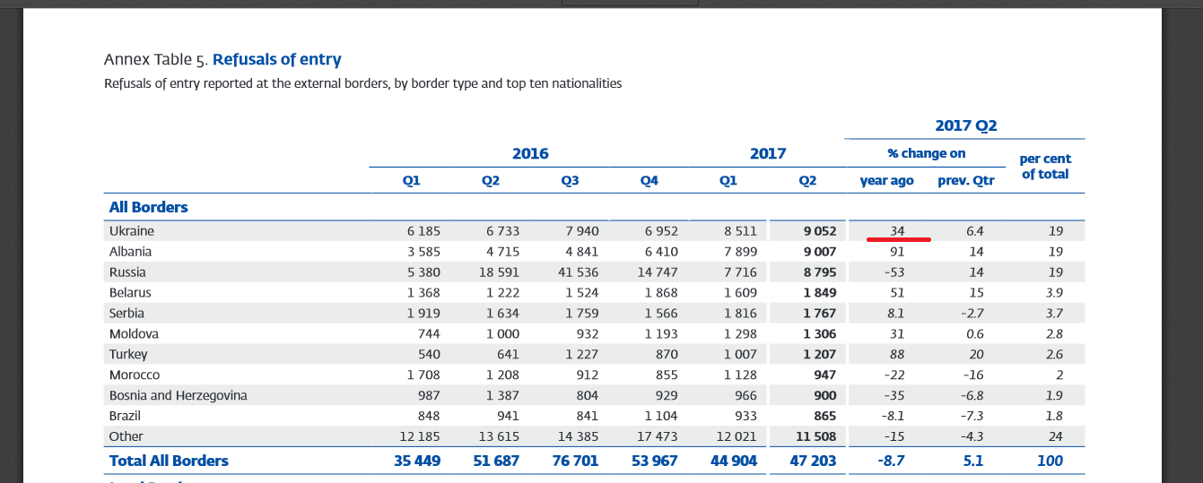 ...Несмотря на отмену визового режима, Украина заняла первое место в списке государств, чьи граждане получают отказ во въезде на территорию Евросоюза. Количество отказов возросло на 34% по сравнению с 2016 годом и на 6,4% по сравнению с началом 2017 года..."