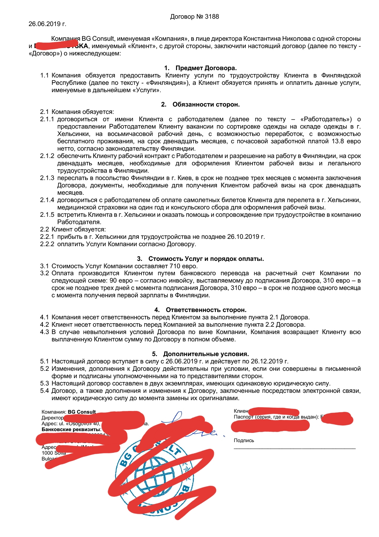 Даже если эта фирма имеет право заниматься консалтинговыми услугами по трудоустройству (поскольку исходя из выписки из реестра Болгарии, они занимаются в основном недвижимостью и инвестициями) этот договор совершеннейшим образом не страхует вас от потери 310 евро, про 90 кстати можете забыть, ибо вы их платите просто так, чтоб с вами просто начали общаться, так сказать. Итак, во-первых, там нет НИКАКИХ данных об этой фирме, не прописан ЕИК (Единый Идентификационный Код), ЕГРПО (Единый Государственный Реестр Предприятий и Организаций, но тут я ошиблась, поскольку это только для Украины), там ничегошеньки нет. ЕИК мне Борис написал в письме, когда я начала возмущаться. В шапке только название фирмы BG CONSULT (и то на англ., не на русском и без приставки ЕООД как в реестре Болгарии), адрес офиса, по которому находится Бизнес-центр, адрес банка и сам номер SWIFT, кстати преимущества оплаты по SWIFT - быстрый перевод денег. ВСЕ. На печати только название фирмы, она там походу просто для красоты. Борис начал утверждать, что от печатей в Европе отказываются, тогда зачем она там? Есть там один пункт - если подписать договор, к примеру, 26.06.19 (как у меня), то не позднее 26.10.19 я должна быть в Хельсинки. Но! при этом фирма имеет право возиться с моими документами 3 месяца, тоесть - максимально через 3 месяца они или работодатель (или все вместе) отправляют мои доки в посольство (а вы сами знаете сколько можно ждать открытия визы с посольства), я жду, ну допустим в лучшем случае без очередей и хорошим настроением консула, если кто-то ранее открывал визу, поймет о чем я, - жду недели 3, хотя это нереально, получаю визу, у меня есть неделя! чтоб собраться, порешать все вопросы, купить билеты, собрать все вещи, списаться и состыковаться с ними. Напоминаю, что отвечать на письма они могут в течении 3х дней) Это разумеется при лучших раскладах, но все мы знаем, что ждать документы с посольства - это минимум месяц, со всеми очередями, потому что народ валит, и вот, вы не успеваете к сроку. Все. Фирма выполнила условия, а то что вы не успели, ну кто вам виноват, деньги мы не возвращаем. Действует договор всего 6 месяцев, прописаны в нем далеко не все пункты, ни сумма за переработки, ни бесплатный обед как в вакансии, написано с возможностью бесплатного проживания. С возможностью, ага. Даже в сумме зарплаты в час и то ошиблись. Договор страхует их со всех сторон, а вас вообще ни от чего. Там нет пунктов о форс-мажорных обстоятельствах, как в нормальных договорах, там просто красиво расписано что "я тетя Таня, обещаю бабе Гале найти работу за границей, а она мне за это даст денег, при чем наперед". Кстати, по-правильному - оплата за услуги такого рода должна быть с первой зарплаты.