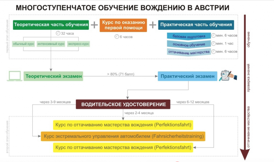 Обучение вождению в Австрии не заканчивается получением прав. Со сдачей теоретического и практического экзаменов заканчивается только первый этап обучения. Через 2-4 месяца после того, как получены права, необходимо пройти в автошколе первый курс по оттачиванию мастерства вождения (Perfektionsfahrt), а через 6-12 месяцев - второй курс. Эти курсы носят скорее информационный характер, их прохождение не составляет никаких трудностей. Вас научат как экономнее водить автомобиль, дадут советы как улучшить свои навыки вождения.