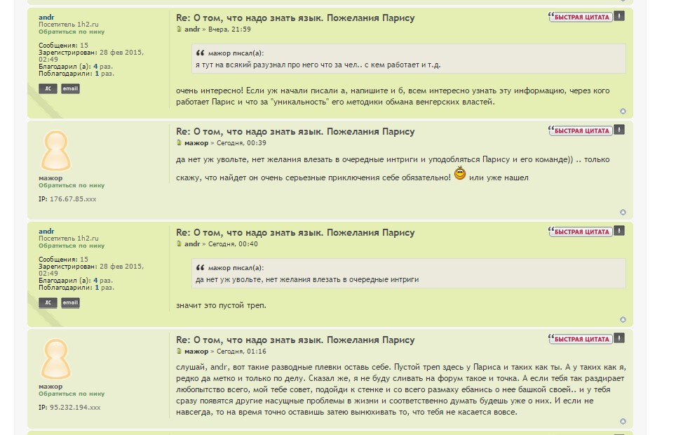 В отличии от тебя, andr, я всегда анализирую прежде чем восхвалять и поклонятся. А ты, как раб по жизни согласен кушать лапшу тоннами, лишь бы эта лапша красиво была тебе подана. Я не к Парису лично претензии имею, а ко всем ему подобным "решалам", лгунам и мошенникам. Но именно Парис держит на этом форуме монополию по "втиранию" и клевете на всех своих конкурентов. А такие как ты идеализируете его почему-то. Одним словом, пенсия разбушевалась..) вот и приходится напоминать время от времени ему, где его место. Твои догадки по поводу меня смешны просто. Скажу только, что психолог с тебя никакой