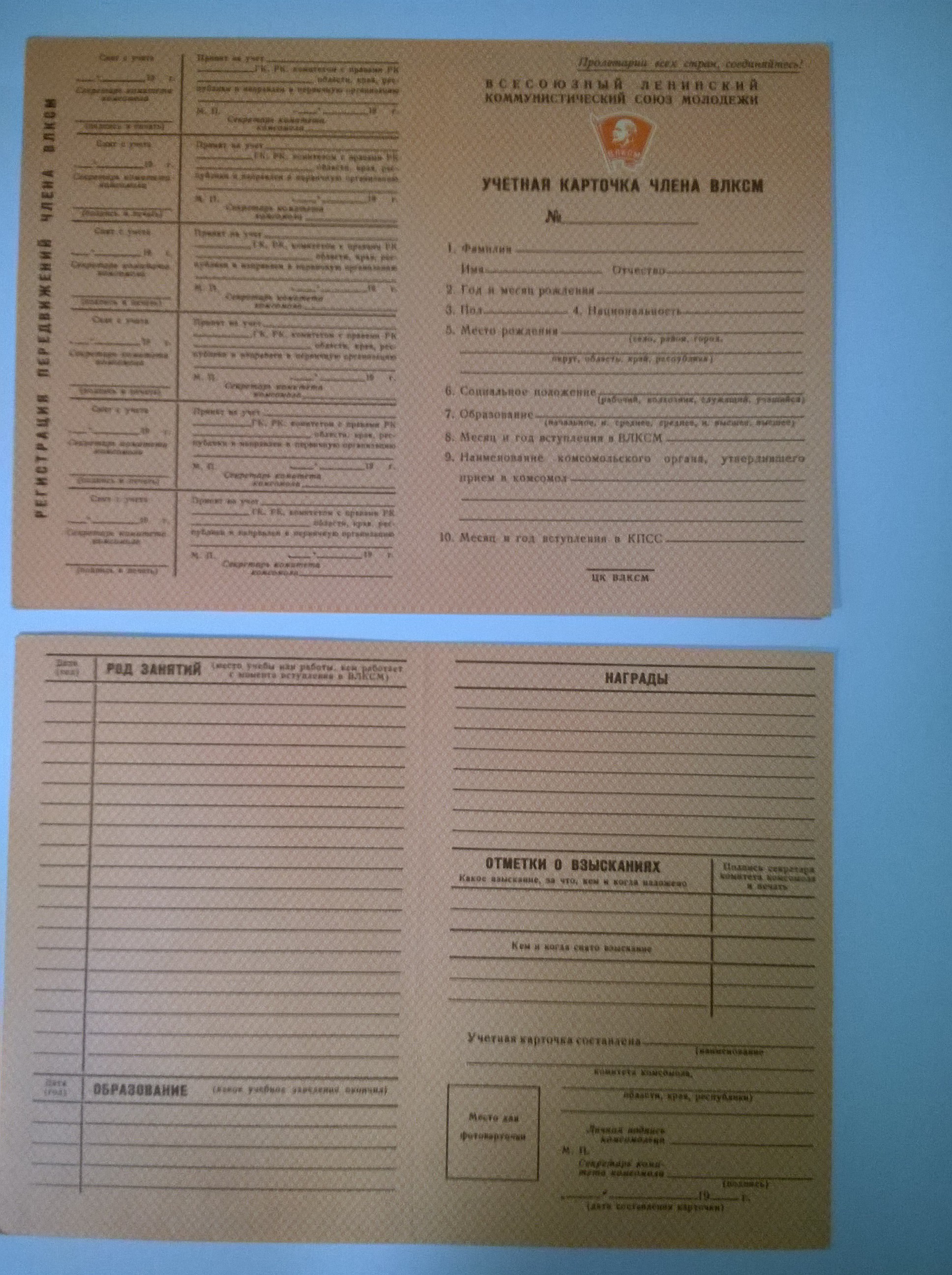 Дайте фото, если заинтересует, может поменяемся на что нибудь?nnn писал(а):Могу к вашему комплекту ещё бланк учётной карты ВЛКСМ подогнать с графой "национальность"