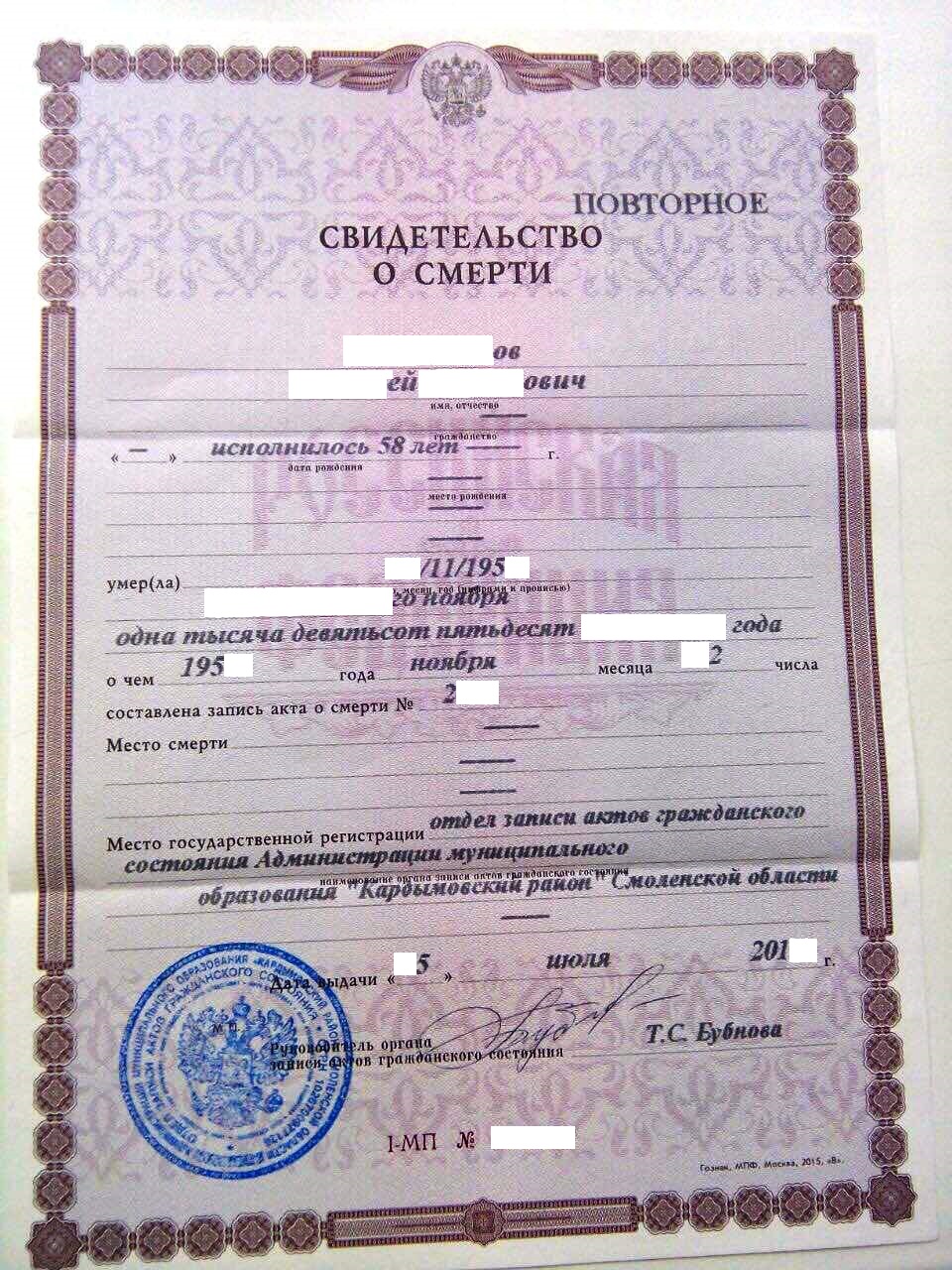 Alyoha писал(а):Источник цитаты Если из ЗАГСа Кардымовского района, то напрашивается логичный вопрос, сотрудники ЗАГСа Кардымовского района выдавали это повторное СОС разве не на основе хранящейся у них (у ЗАГСа Кардымовского района) актовой записи о смерти?