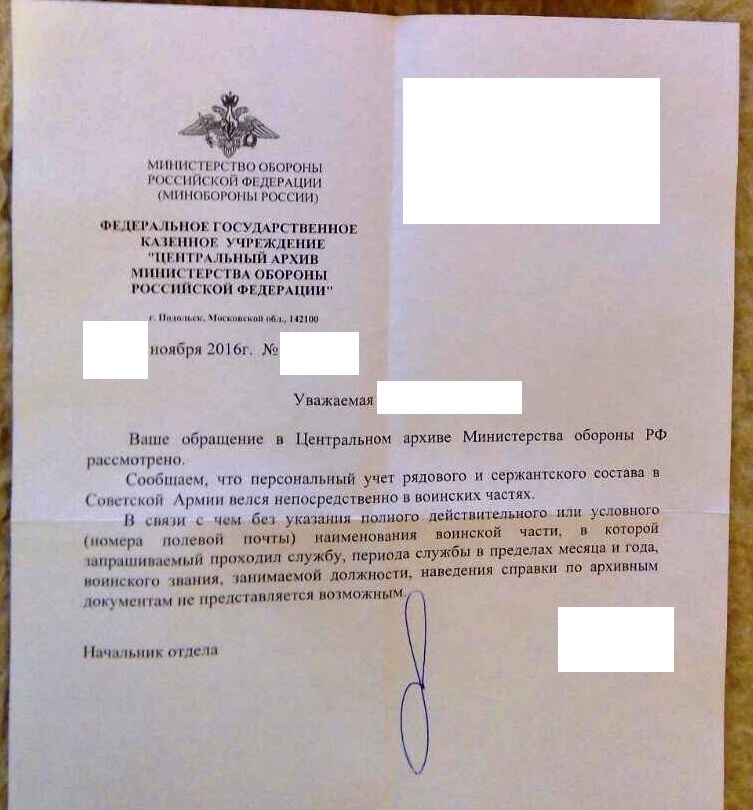Из архива Минобороны пришла отписка, что без указания полного действительного или условного наименования воинской части найти информацию о нем не могут.