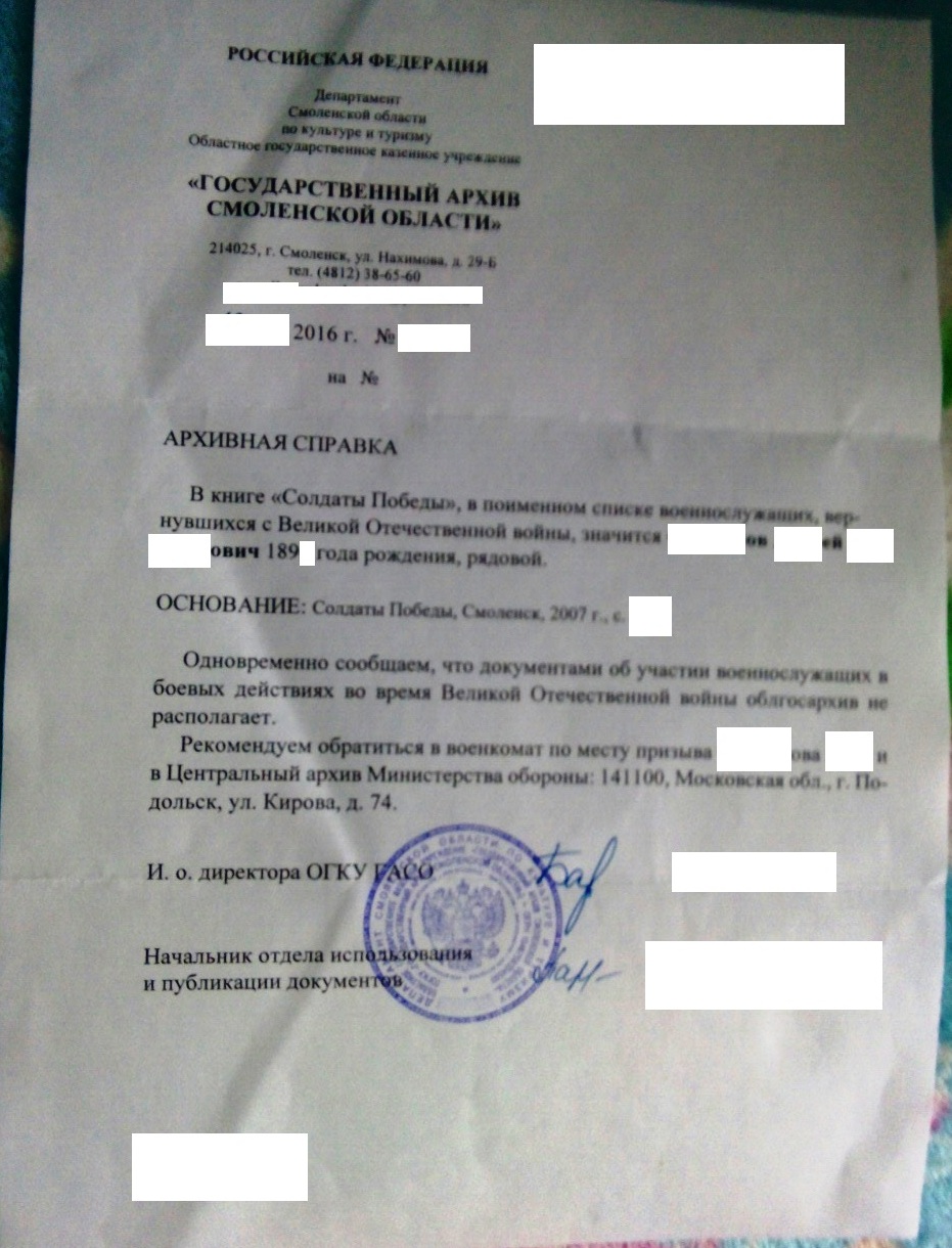 Соответственно эта информация и была указана в запросе (с просьбой предоставить точные данные о дате и месте рождения), направленном в архив Минобороны (ФИО, год {без числа и месяца} рождения, наименование района Смоленской области в котором воевал и воинская должность).