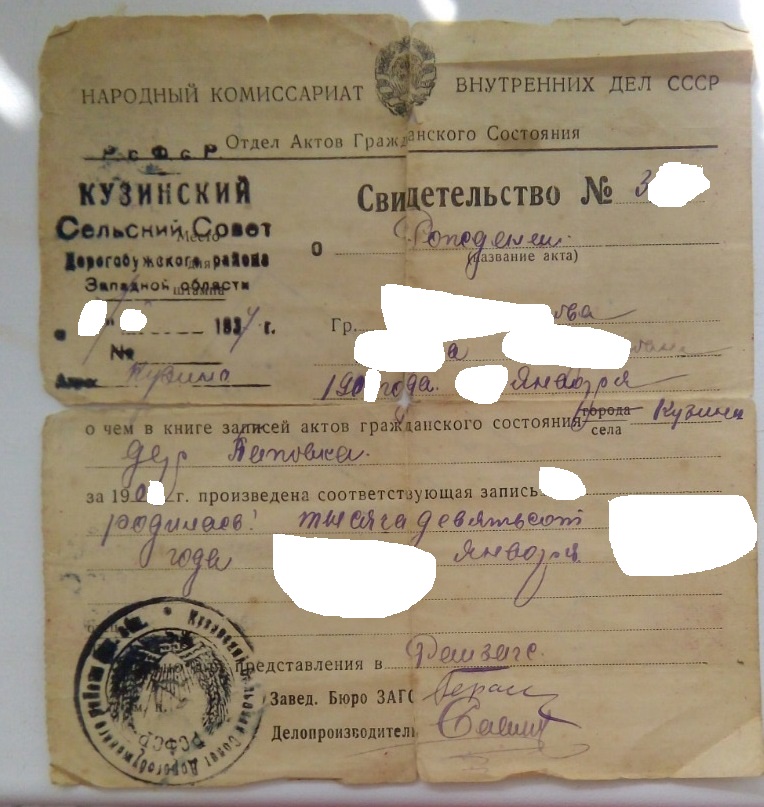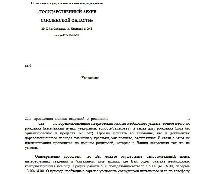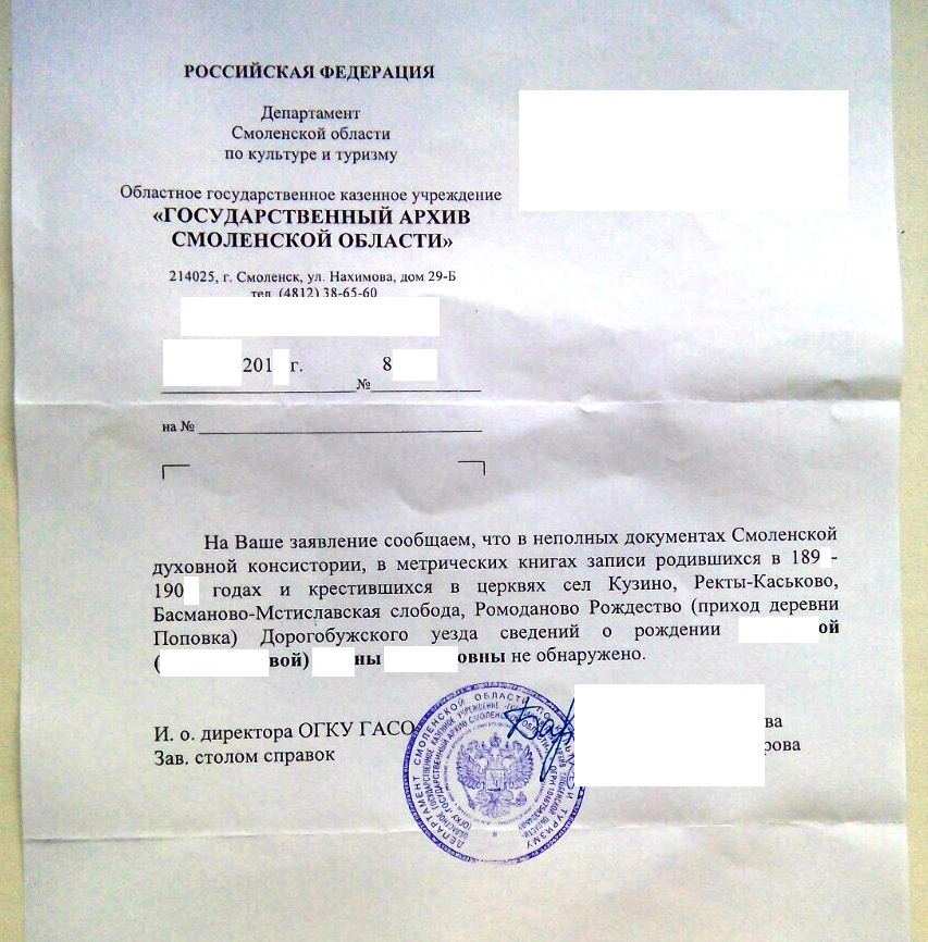"...из Гос. архива Смол. области пришел ответ, что сведений о рождении на самого этого человека (и под фамилией до брака, и под фамилией после брака) не обнаружено..."