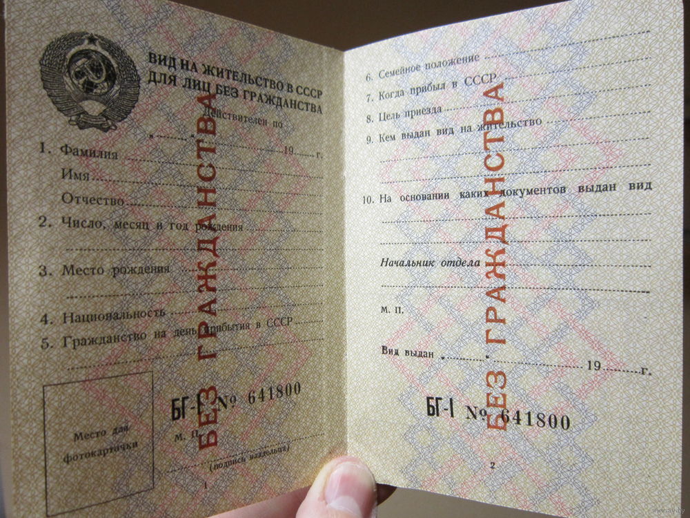 1. удостоверение лица без гражданства, советский ВНЖ выдавался всяким эмигрантам беженцам образца 1979 года.