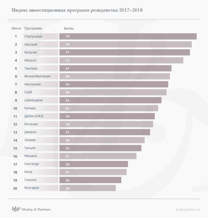 Португальская программа набрала по оценкам специалистов 79 баллов. Вторую и третью строчки рейтинга заняли Австрия и Бельгия, которые поменялись местами по сравнению с предыдущей версией рейтинга. Разница между представителями первой тройки составила всего один балл. На последнем месте по-прежнему располагается Болгария, программа которой требует вложения хотя бы €511 тыс., при этом страна не является участником шенгенской зоны, а сам процесс получения вида на жительство может растянуться на шесть—девять месяцев.