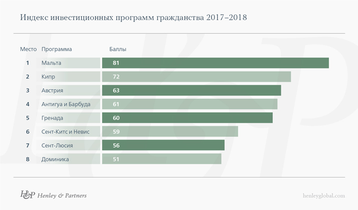 Восемь стран предоставляют возможность фактически купить их паспорт, но лучше всего, уверены специалисты, вкладываться в мальтийское гражданство. Мальта неизменно возглавляет индекс Henley & Partners, опередив своего ближайшего преследователя в этом году — Кипр — на девять баллов. Во многом тому способствует членство Мальты в ЕС и Шенгенском соглашении. Программа позволяет получить гражданство через инвестиции от €880 тыс., предоставляя инвесторам право жить и работать в любой стране Евросоюза, а также путешествовать без визы в 167 стран мира. При этом у Мальты очень высокие стандарты отбора кандидатов на получение паспорта, которые обязаны перед подачей заявки на гражданство пробыть резидентами страны хотя бы год.